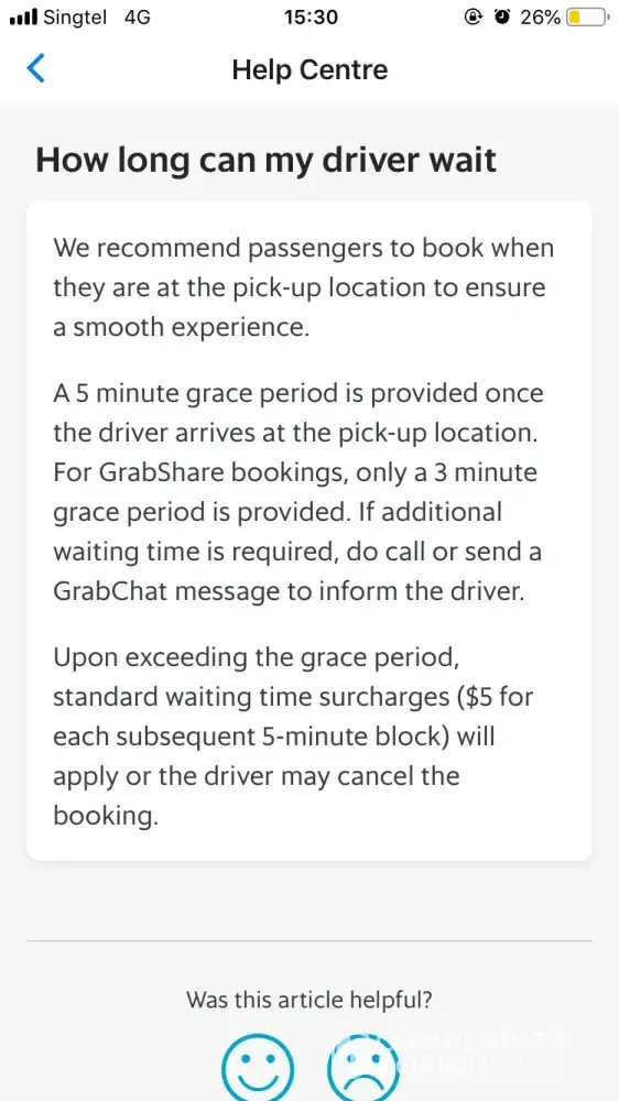 I went to check the terms and conditions. There's only surcharge of $5 for every 5 min late (after 5 min grace period) and no surcharge for booking from wrong location. No information found on surcharge for wrong location (Grab app detected my location wrongly to begin with). (attachment: Screenshot of Driver Waiting Time Conditions by Grab)