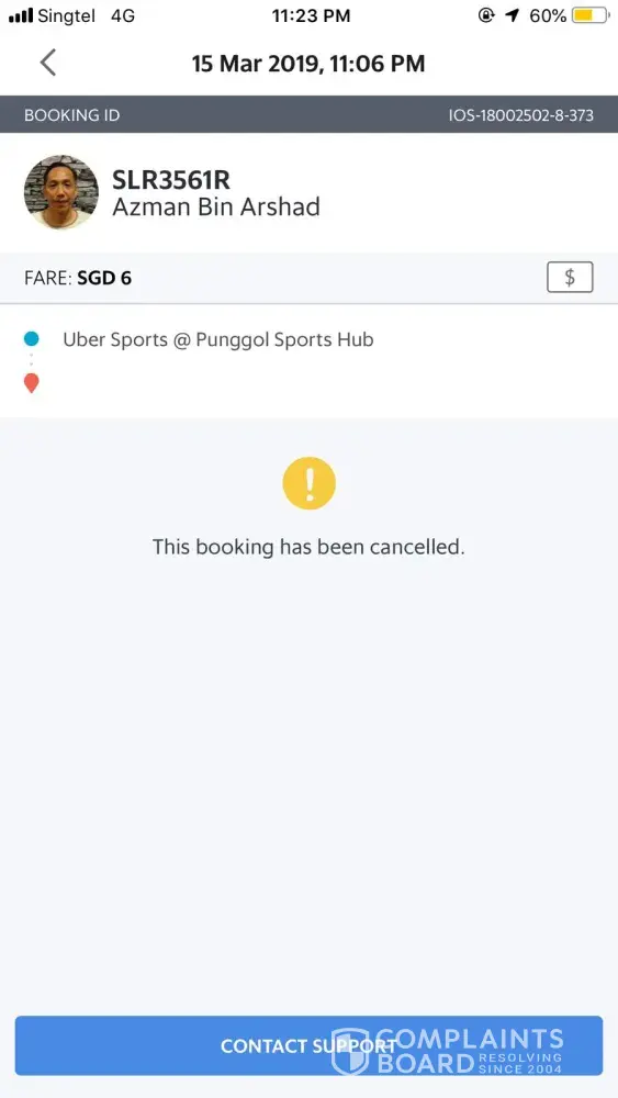 This happened on 9 March 2019. I made my booking at 2.40pm, found a driver at 2.41pm, all the while standing at Stephen Riley Centre in NUS. My destination was at SIT Dover. I received the notification that the driver has arrived at 2.46pm (me thinking he was waiting at Stephen Riley Centre drop-off point). The driver was Choo Kim Leong, Simon. License plate SJB780U. Booking ID: IOS-[protected]-9-001