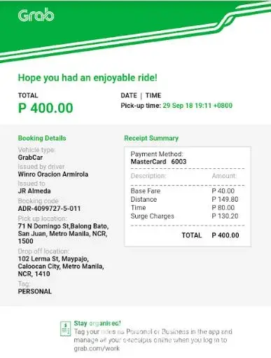 I would like to raise my concern with regards on the attached receipt. I preferred to use my credit card. I topped up to driver and confirmed but the driver was confused on transaction that is why he suggest to pay him on cash. I gave him Php 400. He said if there will be a problem just contact the grab office.