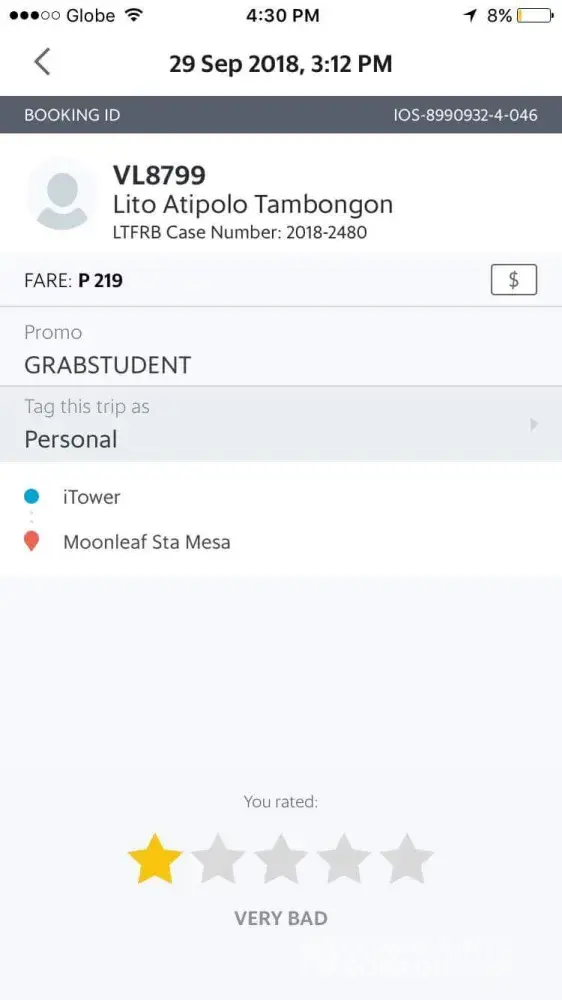 Grab I am complaining for driver of grab car with plate number vf6905- rodrigo fernandez amin jr.
