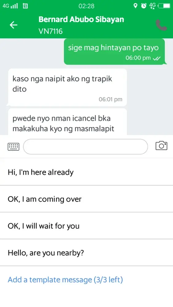 September 29 I book grab around 5:35pm at Rosario baranggay hall and VN7116 (Bernard abubo sibayan) accepted it so after few minutes I asked him if he's nearby because I saw he's not moving but I know he's not so far from where I am so I played games on my phone while waiting then I check the app if where he is and I was shock because he already pass from where I am and too far then he message me that waze guide him in wrong way so I asked him to cancel it so I can book another cab and he told me if I'm in a hurry I should be the one to cancel it... I Dont want to cancel because I don't want to be charged so I waited and I can see that he's not moving from where he is and until now it's 3:00am he's still in the same place and he's not cancelling the booking he also told me he'll be thankful if I report him to grab because he'll have reason to leave. I don't want to encounter grab driver like that anymore I am a regular customer I have to ask my friend to book grab for me so I can go home I cannot book because until now he's not cancelling the booking and I don't want to cancel also I want him to learn his lesson.