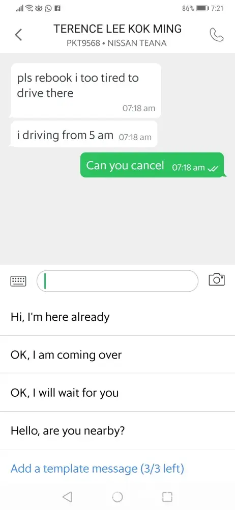 Since there is no proper place to wait i decided to send msg to the client. After 2 msg send without any reply i make a call via grab call and still no pickup. I make a normal call pickup and client told me that she never make any booking.