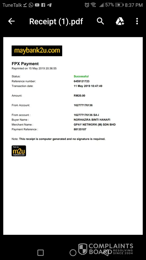 Tunggu punya tunggu tetap tak masuk akaun grabcar saya, saya buat lagi sekali payment online(maybank2u) pada date yang sama 11/5/2019 sebanyak RM20, untuk yang ni masuk dalam akaun grabcar saya. Jadi bolehlah saya terus booking untuk ke Mydin USJ
