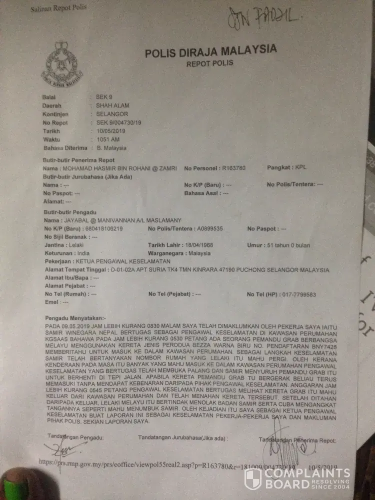 Hi, I would like to lodge a report on a grab driver because he acted so irresponsibly by punching one of my security guard. I've attached the report and a cctv footage of the driver for your information. I need this grab company to take severe action towards the driver. Your cooperation to investigate on this matter is much appreciated.