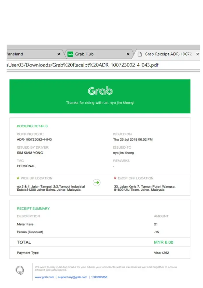 We booked Grab and using the promo voucher and paid by Credit Card, but this driver ask for another extra charge RM 6.00. This is very improper and we feel deceived, as the driver seems like to took an advantage.