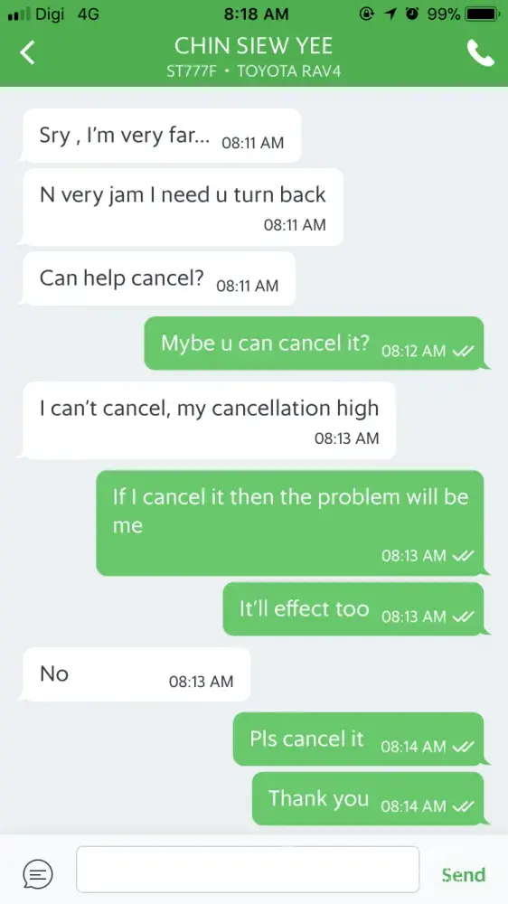 Today around 8am morning.. I requested a grab.. Few minutes later the driver texted me and ask me to cancel the trip since he's far away from my pin point.. So I ask him to cancel it since he's the one don't want to pick me up but he insisted me to cancel it because he couldn't cancel the trip due to his cancellation is high.. So? It's mean he cancelled quite a lot right? Why did you accept a trip if you're going to cancel it? So a grab driver can choose a trip as they want? What kind of service is that? The gps showed he going way further from the pin point then I asked him to cancel it so that I can request a new driver but he didn't. He even told me to wait him for half hour to pick me up if I don't want to cancel the trip. How rude? This is treatening. Again, what kind of service is that? Ruined my morning!