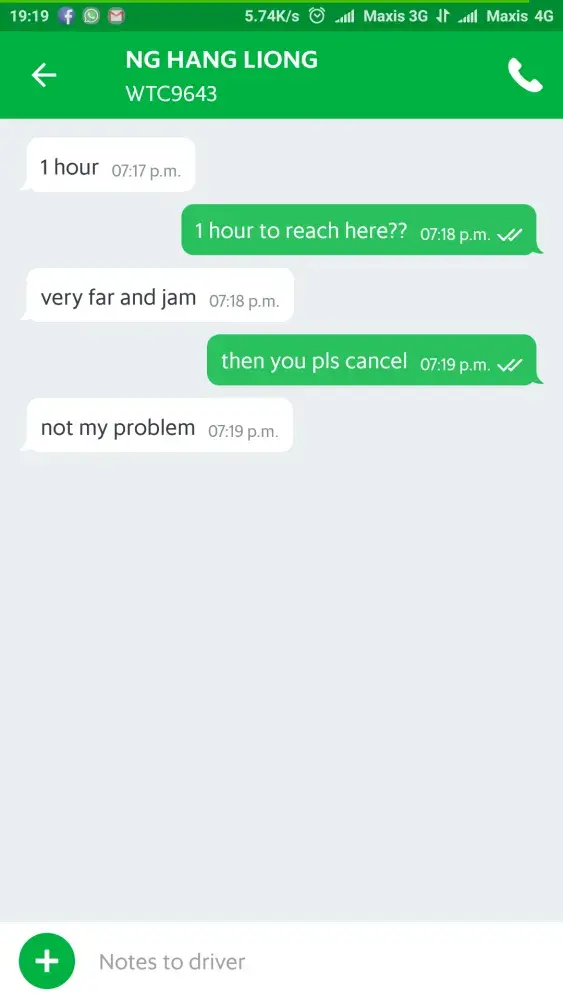 He accepted the request but messaged me and told me to wait 1 hour. The estimated fare was RM 14. He said that my location is very far and very jam. I told him to cancel from his end but he said it was not his problem. Well, that would be true if he did not accept the request but he did accept the request, so it was HIS problem. I got a metered taxi which cost RM 10 in two minutes after. Rude driver NG HANG LIONG.