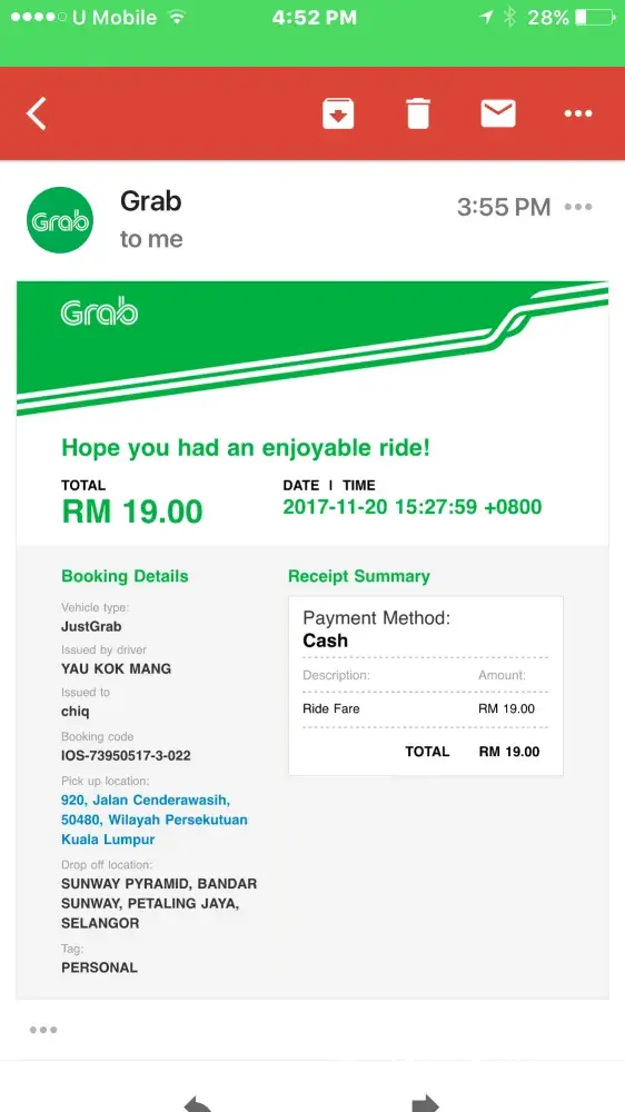 Grab car malaysia company would not read our complaining and give us the solution. because in the business only money number 1, service is last.