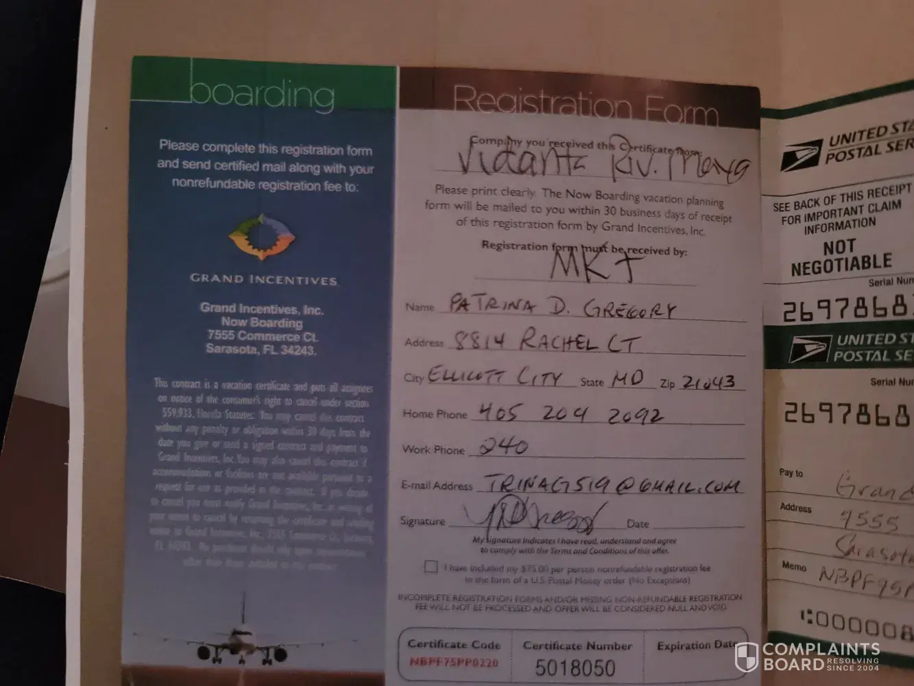 GRAND INCENTIVES NEVER SENT THE TWO COMPLIMENTARY AIRLINE TICKETS PROMISED!