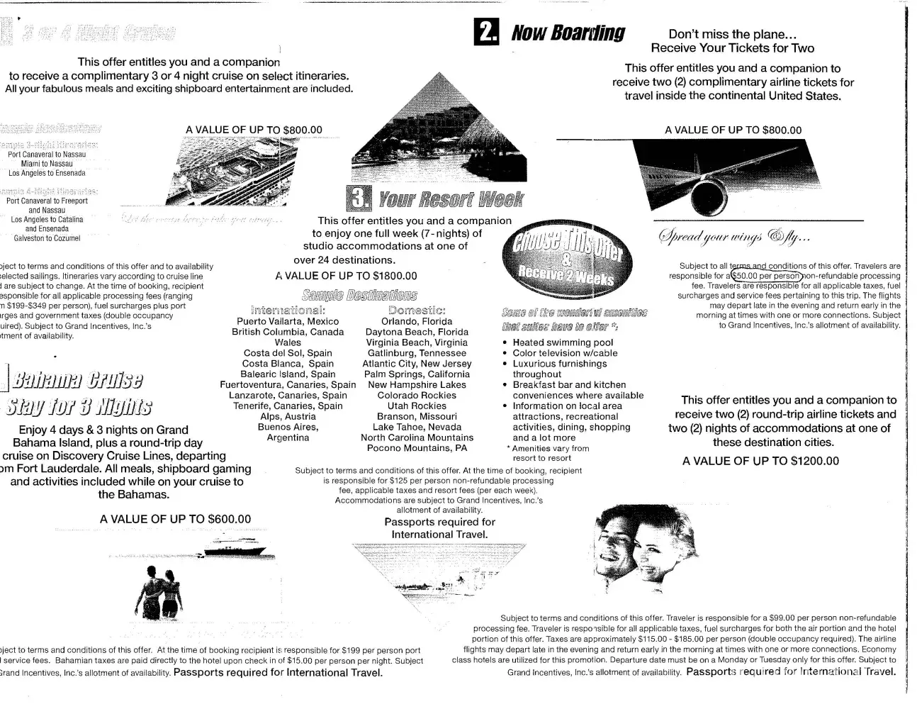 SCAM! My fiance and I won a Grand Incentives Trip last October 2011. We immediately sent in our application for the trip along with the requested $100 (each person) for the processing fee. About a month later, we received a form that asked us to choose 3 different destinations on three different dates, that are no less than 30 days apart from each other. On...