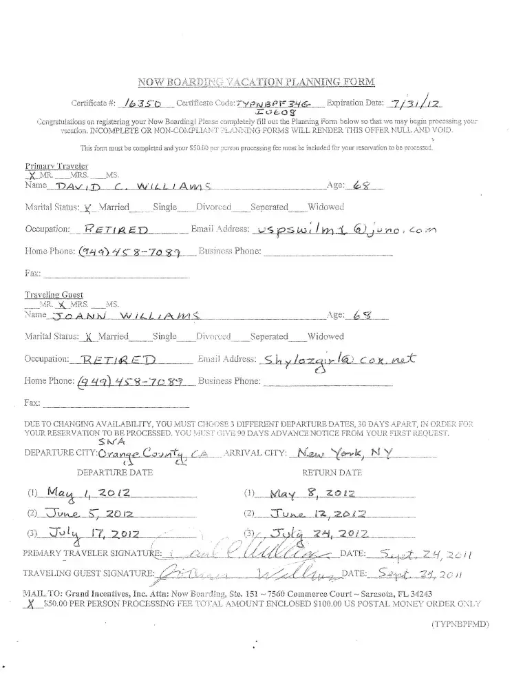 I completed their forms and sent the money order. Our trip was voided! They said our form was not completely filled out. I tolded her the only fields that I didn't complete was the fax number because we don't have one. She told me that I should have put NA, none or a line thru it! I told her there wasn't anything indicating that I needed to put NA, none or line if you don't have a fax number. She said it doesn't matter, the form was not completely filled out and I should have read the instructions! Really? they voided the trip because of that? Rediculous! They returned the money order but now I have to pay $15 to get it refunded which can take up to 30 days. They make it almost impossible for your to get the FREE trip which of course isn't free because you have to pay the $50 per person processing fees plus taxes, port fees or whatever other fees that get tacked on.