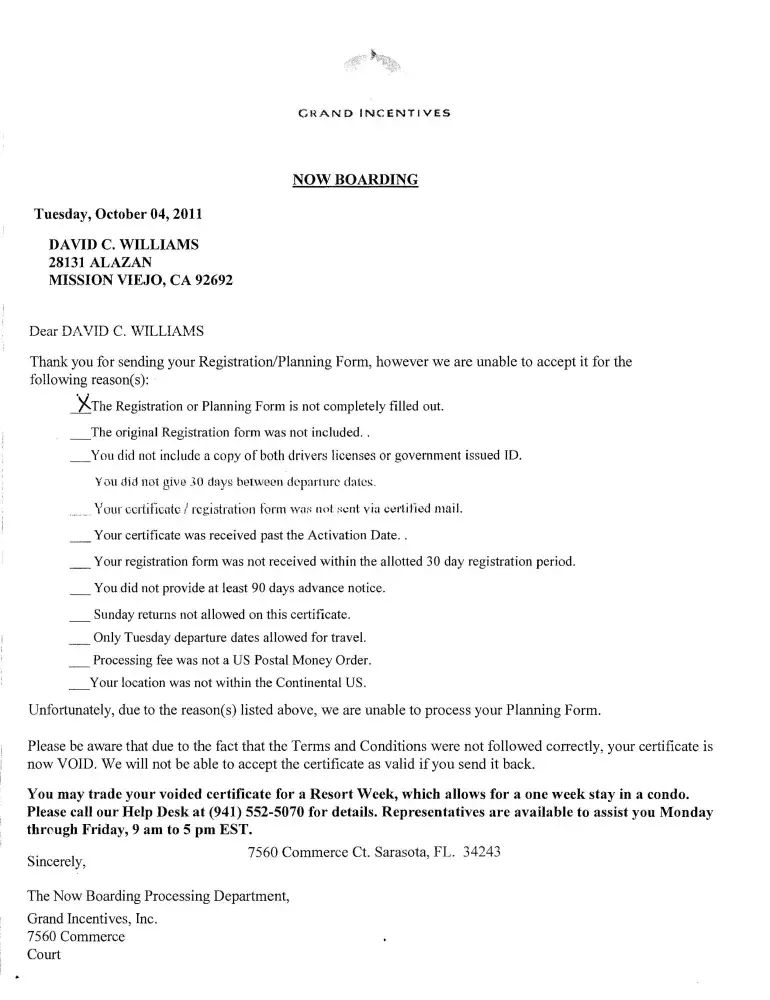 We applied for Now Boarding airline tickets at $50 each. The tickets were offered as an incentive to attend a Vacation Club presentation, which we did. We were required to submit 3 separate travel dates within highly restrictive parameters, a postal money order, and copies of our drivers licenses. We met all time limits and submission requirements. We received the attached rejection letter stating that our registration form was incomplete and that our certificate had been invalidated. The only items not filled in on the form were "Business Phone" (we are both retired) and "Fax" (we do not have a fax machine). Attached are copies of our registration form and the Now Boarding flyer (Item 2. There was no legitimate reason to invalidate our certificate.