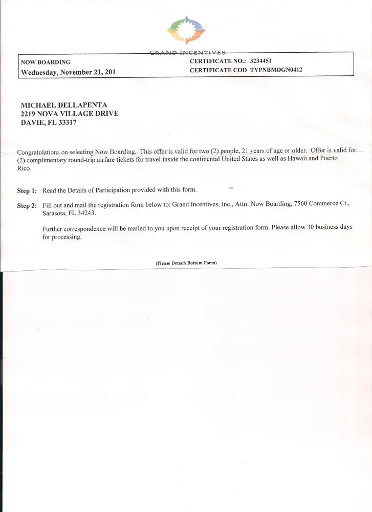 Was promised two free airline tickets & $100 gas vocher.Was told to fill out regristration form, and sent it to their office 11-21-2012.Received a letter of denial stating that i didnt sent it certified mail.They never told me that or stressed the fact, of certified mail.These people are your typical SCAMMERS!. Can you look in to this, before somebody loses a lot of money.