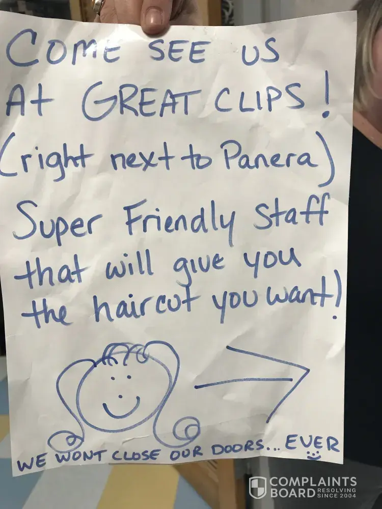 I went to my previous salon in Stow, Ohio on Kent road which has closed and found a handmade sign that I thought was very unprofessional. Maybe if the sign wouldn't have been drawn in an unprofessional matter it wouldn't have been so upsetting. It was a tacky way to try and get more clients. I feel there is more professional ways to build a business and the sign was a lame way to try and do so. Especially since it was posted over a sign that already had information that I needed to see.