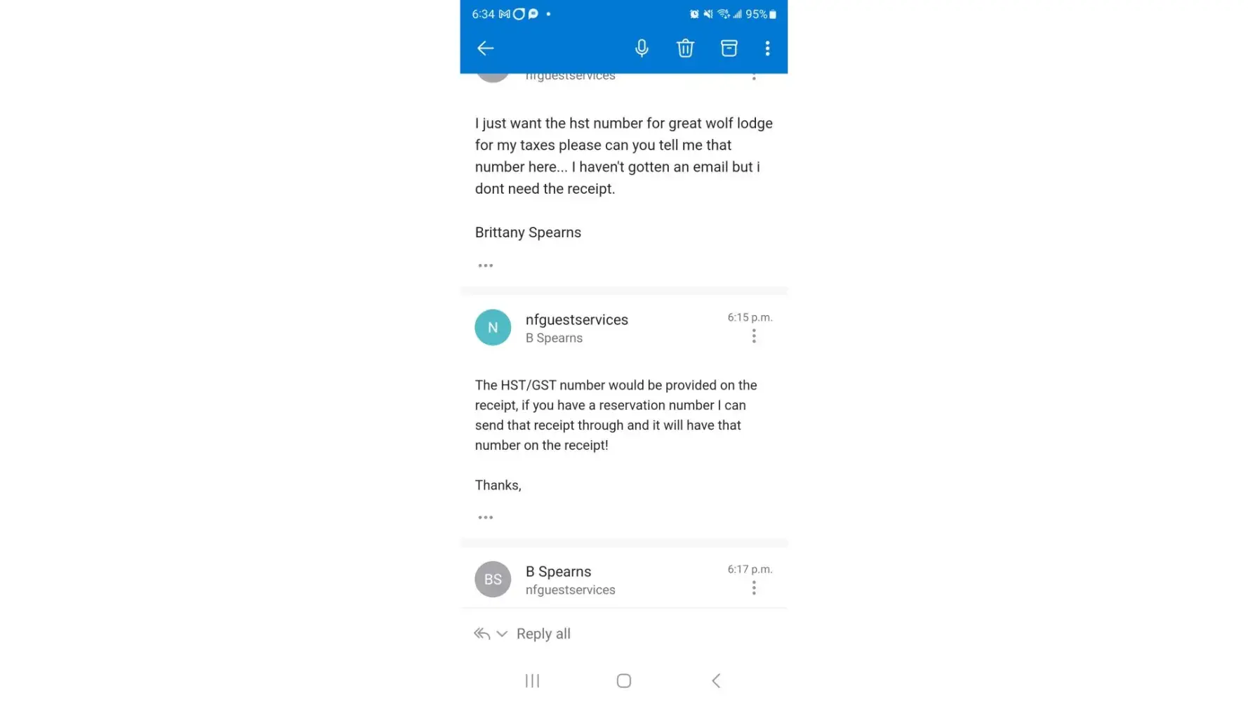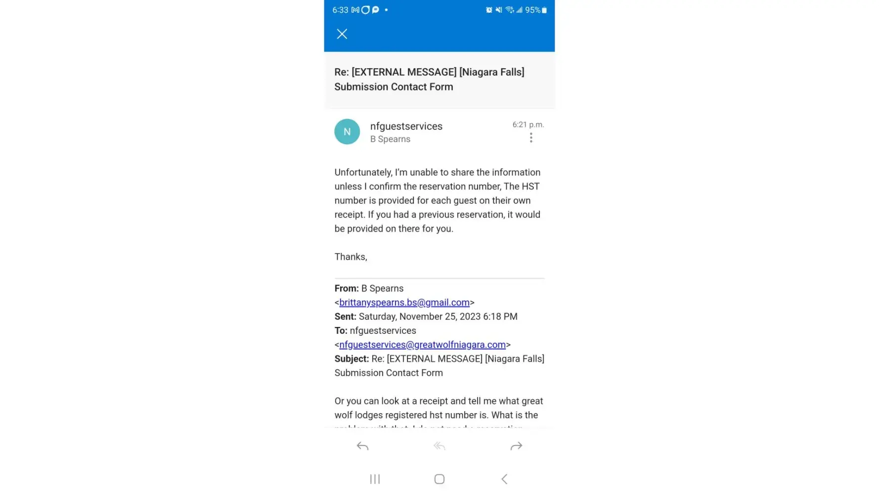 This is precisely why I had the problem in the first place. It explains in my complaint that I was asked for a reservation number already. I do not need to provide a reservation number, especially if I no longer have it because all I am asking for is the HST number. Which I looked up online because all of this is apparently very difficult for the staff there to provide. So I solved my own problem. But thank you for asking the same thing as what I had an issue with in the first place ..