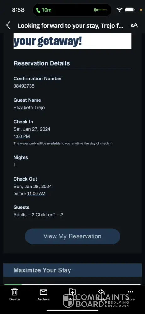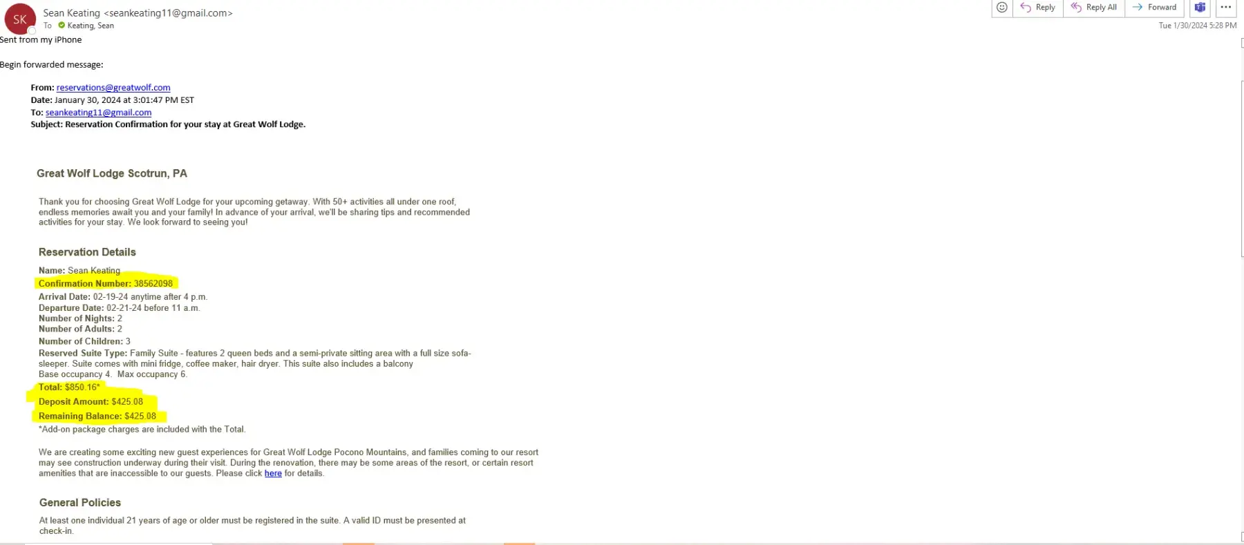 Great Wolf Lodge Reservation confirmation