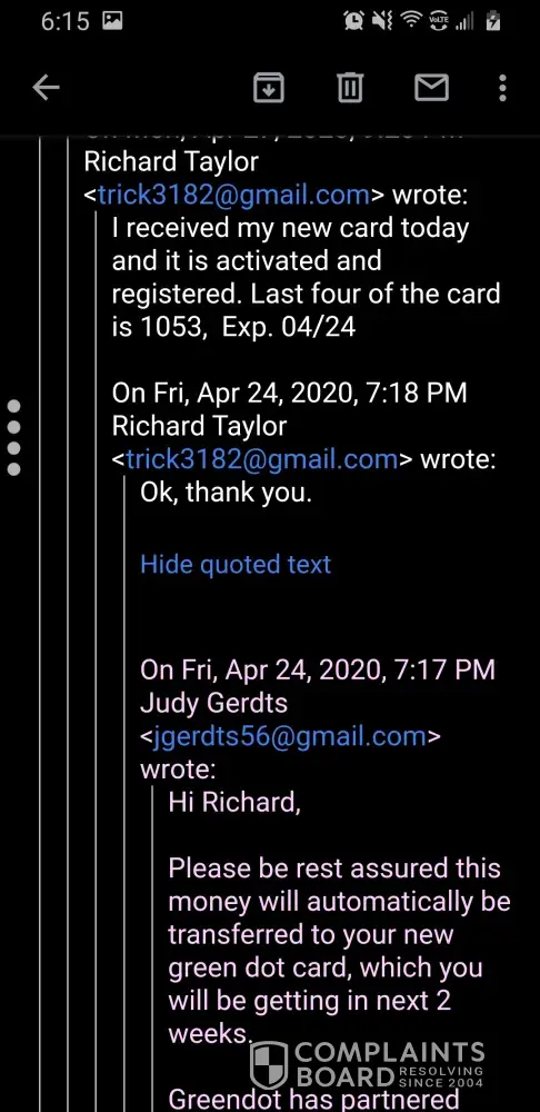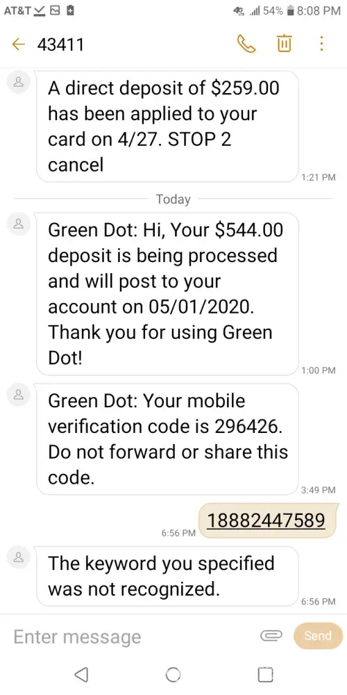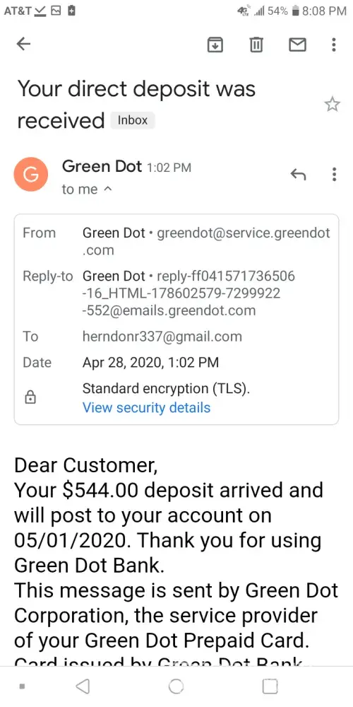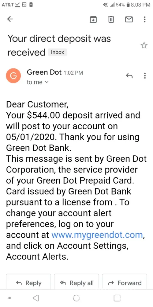 Green dot is nothing but thieves and liars straight up this company needs to get shut down for good I received an email from green dot today including a text message saying they received my direct deposit but will not post it until may 1st 2020 when i'm supposed to get it 4 days earlier from what there site says since the 3rd lands on a sunday and the social security is closed on the weekends so I called them about it and green dot told me that there wasn't any pending deposits which is a lie because that's not what the email told me and the funny thing is i've been with green dot for several months now and haven't had any issues until now the green dot site says if you set up direct deposit you'll receive your government benefits 4 days earlier and top of that green dot also told me once they receive the notification from social security green dot will post the money to your account now take a look at the different dates when my social security goes into my green dot account I took several screenshots of it including the email they sent me these people are nothing but thieves and liars