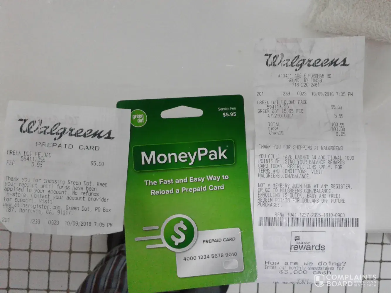 Let me begin without getting upset. My name is Juan Vergara. I want to open an E-bay store. I was " instructed" by PayPal You-tube videos that I would need to purchase a (MoneyPak) at certain stores. I whisked on over to the nearest Walgreens and purchased a Green Dot MoneyPak in the amount of $95.00 plus the Service fee of $5.95 extra. I went to the cashier paid by cash at the counter and the MoneyPak was "scanned?" I was given a store receipt. I tried, and tried, and tried fruitlessly to contact both The Green dot / MoneyPak representative via the number given : [protected]. To transfer the cash into my PayPal account or transfer my cash into my checking account? Remember, I told you that I've watched You-tube PayPal videos and the other ebay Sellers gave instructions step by step to buy a MoneyPak and add cash into it at certain stores. The phone contact [protected] is automated without putting me thru an Operater (agent) which I need. It keeps saying "put your 16 digit " or your Social Security? Over the phone. No way, Jose! I have no 16 digit number on the green MoneyPak? Just to scratch off the back part which has 14 digits. My phone : [protected] or my e-mail me at [protected]@Yahoo.com to contact me. I want this resolved. I purchased the green dot MoneyPak at Walgreens on October 9, 2018 at 7:05 P.M. The Walgreens phone [protected]. I want someone to personally contact me because...I still have a $95.00 in a MoneyPak that I paid for in $5.95 service fee... And I got no service? To charge me a service fee! I need you to transfer my cash into either my PayPal account or my Checking Account. Juan.