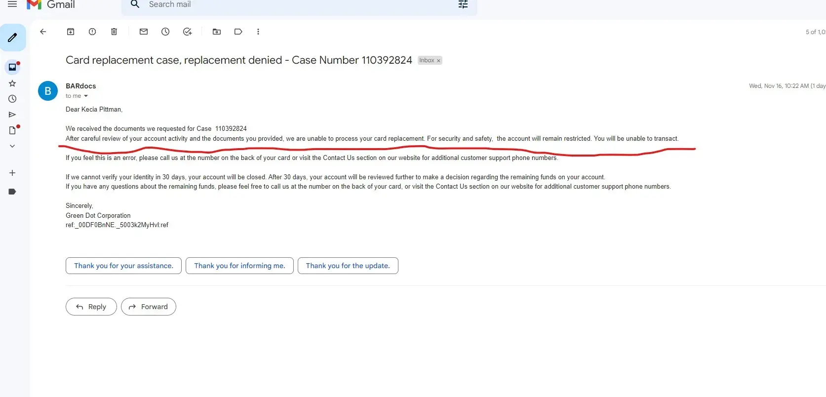 Dear Kecia Pittman, We received the documents we requested for Case [protected]. After careful review of your account activity and the documents you provided, we are unable to process your card replacement. If you feel this is an error, please call us at the number on the back of your card or visit the Contact Us section on our website for additional customer support phone numbers. If we cannot verify your identity in 30 days, your account will be closed. After 30 days, your account will be reviewed further to make a decision regarding the remaining funds on your account. If you have any questions about the remaining funds, please feel free to call us at the number on the back of your card, or visit the Contact Us section on our website for additional customer support phone numbers. Sincerely, Green Dot Corporation. I called in and spoke to a representative. She said my account was marked fraud because of an ACH direct deposit was inadvertently routed to my account. Do note I only receive a direct deposit from my company on 11/10/2022