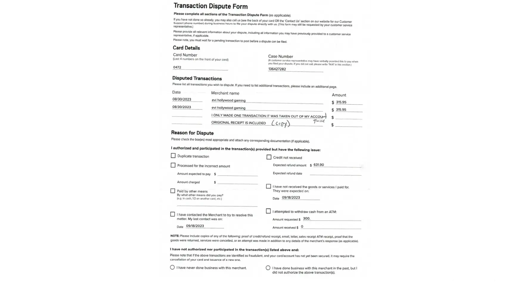 Desired outcome: i need my money returned to me asap. i have bills that are late because of this,it is costing me more money besides the transaction amount and many hours of wasted time