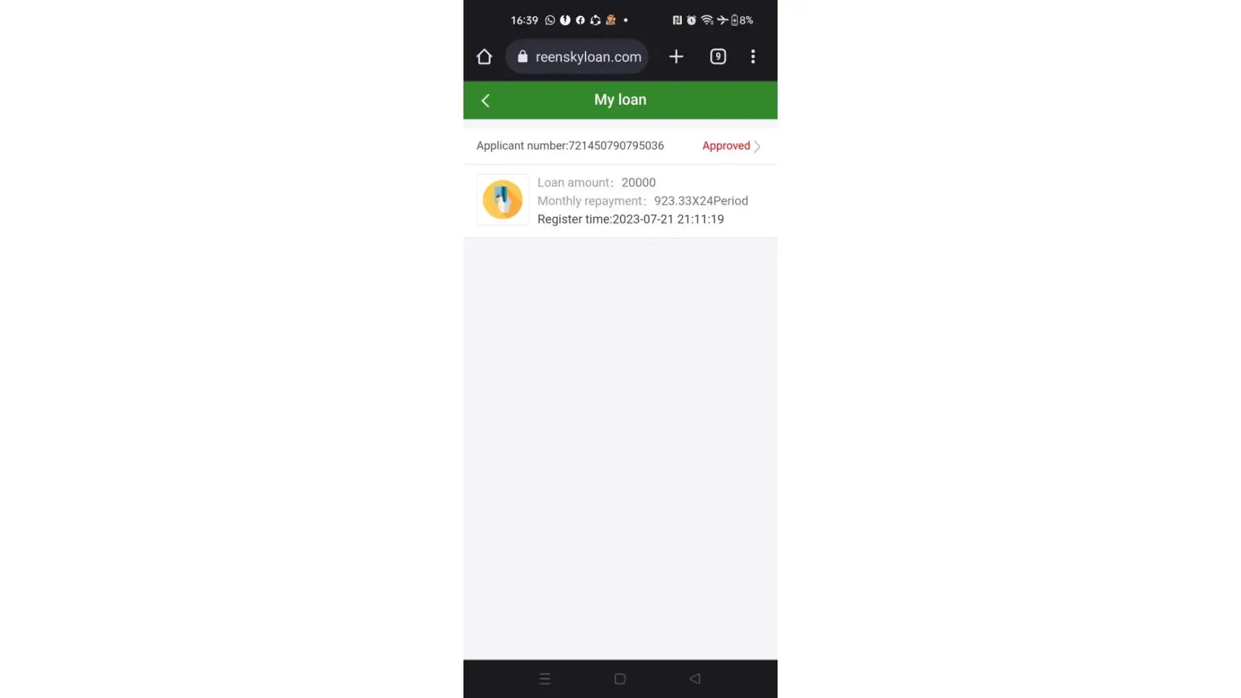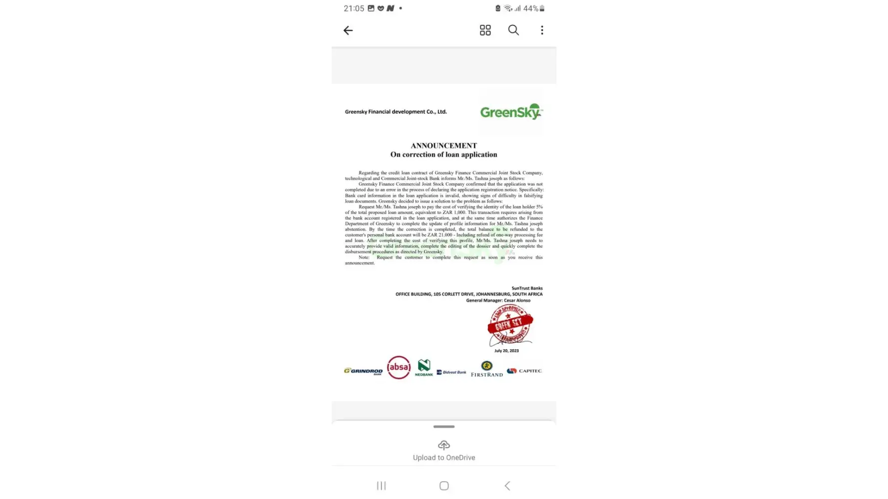 I had applied for a loan and was approved by green sky, for R 65.000 and they had sent me a link where I had to log in on my profile, when I logged on, the amount was there, and I was told yo transfer it to my bank account, when I did that, it asked for a OTP, and I never receive the OTP, then I phone Green sky and I was told to pay R 1000 for the OTP, after I had paid the R 1000, I was block by Green Sky, (see attachment) and they had stole s R 1000 from me, I want my money back, or I will report Green sky, all over social media, they have 24 hours to do so.