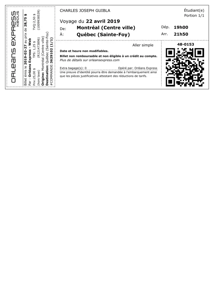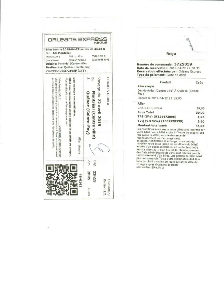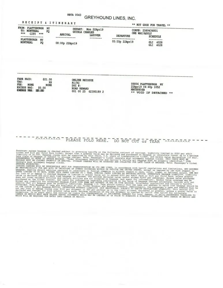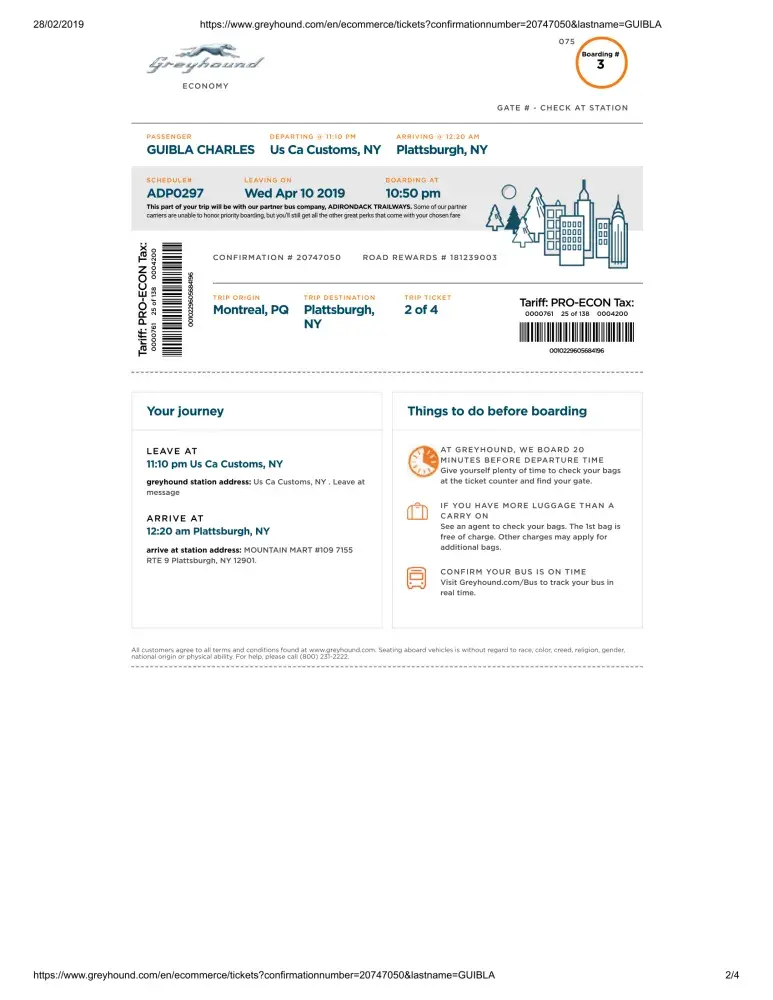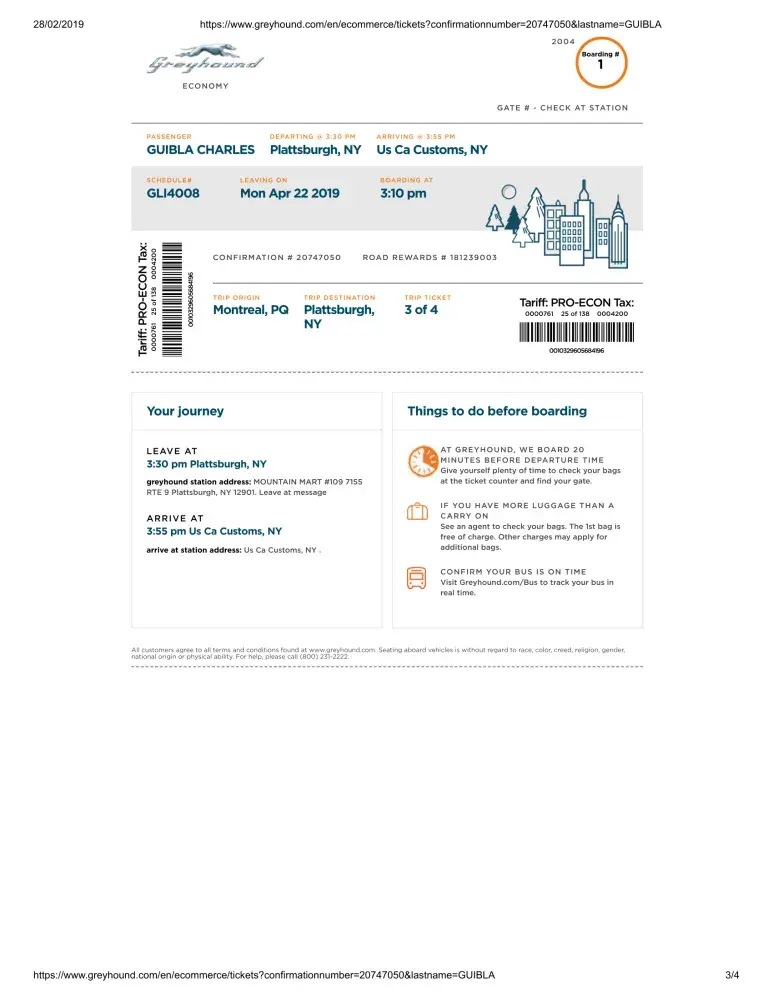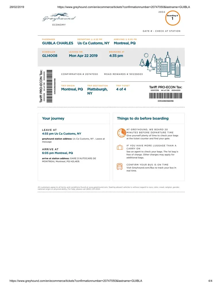 In view of the foregoing, I would like by this letter to make a complaint against Greyhound for these actions which are not worthy of the professionalism expected of a company like yours. This situation forced me to delay my trip and to ask for another ticket to take the 5:55 pm bus.in addition, I was scheduled to take a bus to Montreal for Quebec City at 7 pm. I missed this bus and I was forced to pay another ticket which amounts to 44.85 Canadian dollars. Therefore, I claim the reimbursement of the costs related to this ticket.