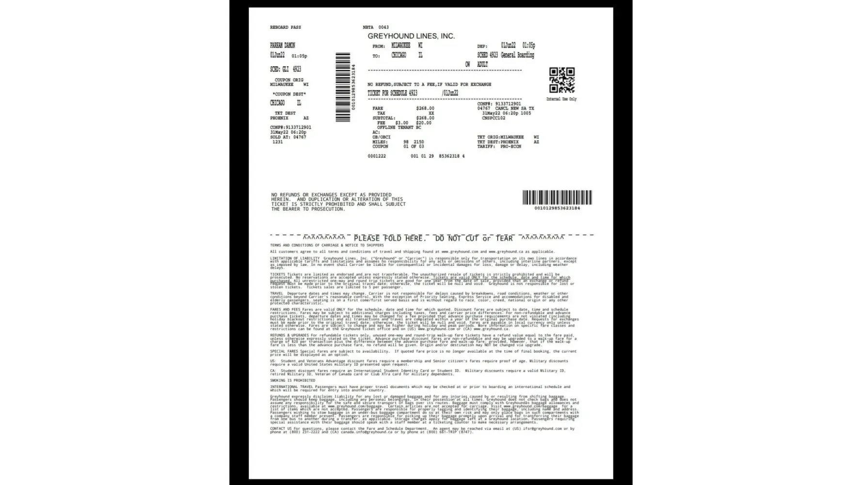 On May 31, 2022, approximately 1820, I, Titus Whitelow purchased a greyhound ticket for Damon Parham from Milwaukee. WI 1305 hours, June 1, 2022, to Phoenix, AZ 0640 hours for $268. Which, they failed to enter the correct name, Damon Parham, a the passenger. Also, I was coerced into accepting additional charges for that name correction.