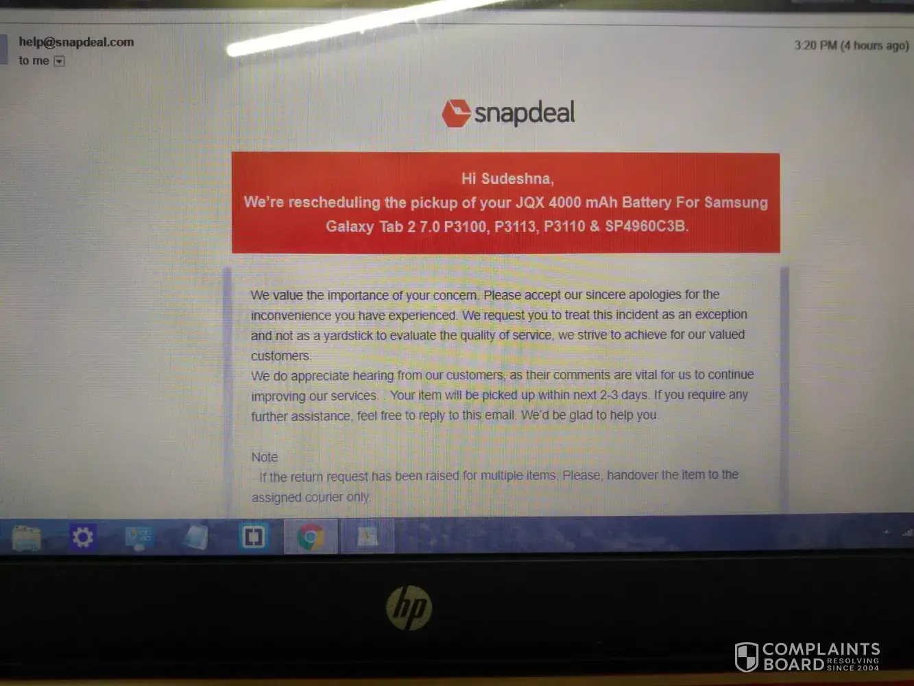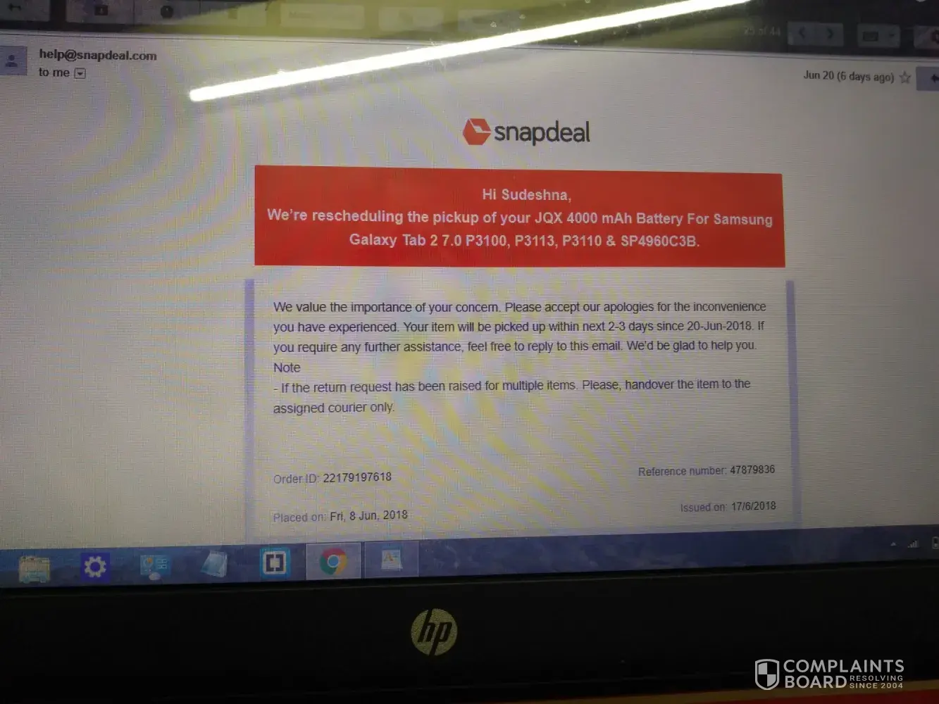 I have placed an order for an Jqx 4000mAh battery for samsung galaxy tab 2. The reason for the return was that the product was damaged and defective.The pick-up boy came but refused to take back the product on grounds of "unoriginal product" according to himself. Subsequently I have informed the Snapdeal people via email ([protected]@snapdeal.com) to reschedule the return.Reply from them takes about 1 day to arrive, meaning 1 more day is lost from return window (23 Jun, 2018). On 20th June, 2018, they sent me a mail for reschedule.