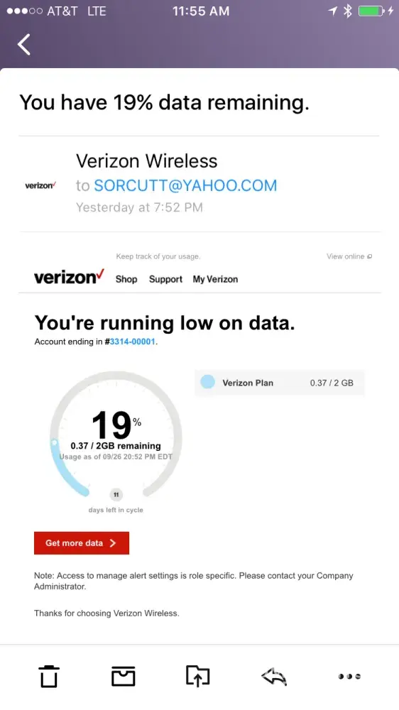 I get an email from Verizon every month with somebody's business bill and I get all of their data alerts and anything that Verizon needs to email this business. I don't have Verizon and I have called them several times and tried to get them to stop emailing me this other person's stuff. They talk and pretend like they are fixing it, but they don't.