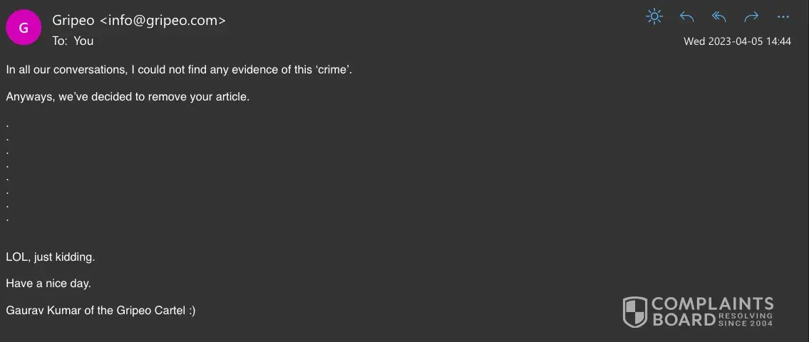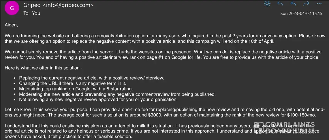 Gripeo writes up fake reviews and then tries to extort people for it. Currently they are charging $2k-3k to take down stuff.