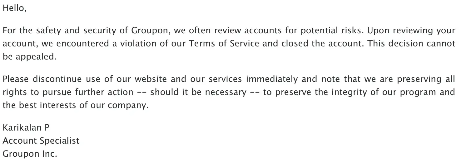 I have a groupon account and have been using it for years. I attempted to log into but it said the account did not exist. The customer service told me that they closed my account because I have multiple accounts (I have additional account to purchase a skydiving voucher for my nephew and just used once) but were willing to give me back my usused voucher. I complied the ones I have not used (8 ones, with a total value of over $300) and send them to the customer service. They changed their attitude and told me my account was “a violation of our Terms of Service and closed the account. This decision cannot be appealed†and asked me to immediately stop using their service or they will take “further actionâ€. I felt so disappointed as I was always a loyal customer to groupon. I just think it does not make sense for them to close customer’s account without notification, even though the customers might have violated some rules, which I honestly don’t know about in the past. It is ridiculous that groupon says the value of the groupon we purchased never expires and then they just shut down the customers’ accounts so they can never have their money back. I hope more people will know the way they treated some customers and even threatened them with “further actionâ€. I will never work with this company again.