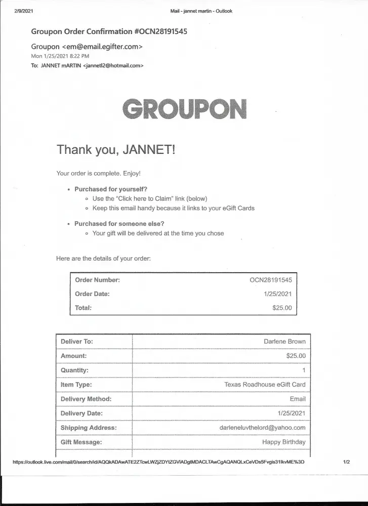 Second complaint: I purchased a Texas Roadhouse gift card through Groupon and asked to email to the person as a birthday gift. She informed that she never received. I have tried through the to talk to someone. I sent all the copies of the emails I received from them and my bank statement where the money was deducted from my account. Again, no help.