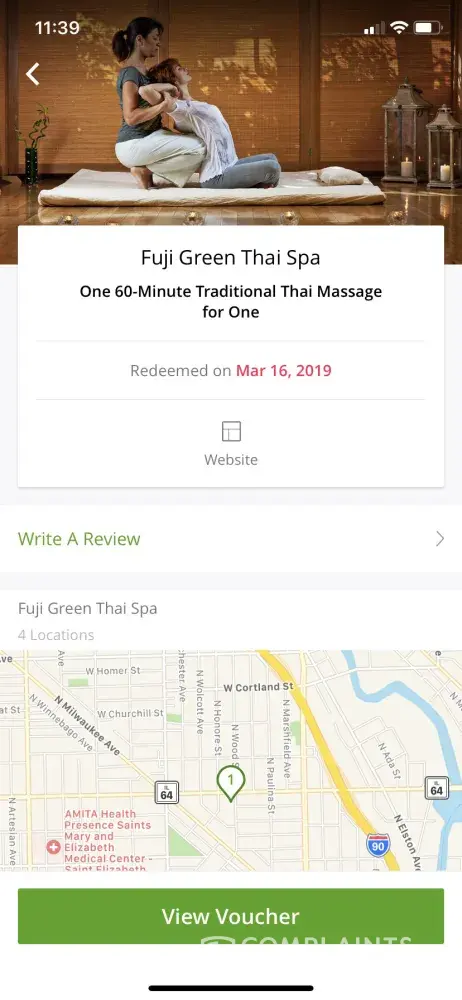 I bought a Thai Massage for $60 through Groupon on March 16, 2019 and it was immediately marked redeemed. I went to redeem my massage, today (May 3rd, 2019) and discovered this was a scam. In googling the issue I see thirteen other complaints reporting that it is a scam. I would like Groupon to refund my purchase of $60. Please see a photo of the purchase below that have not been able to redeem. It also states that the purchase expires on July 14 2019. I've called the number and there is no answer stating that it is out of service.