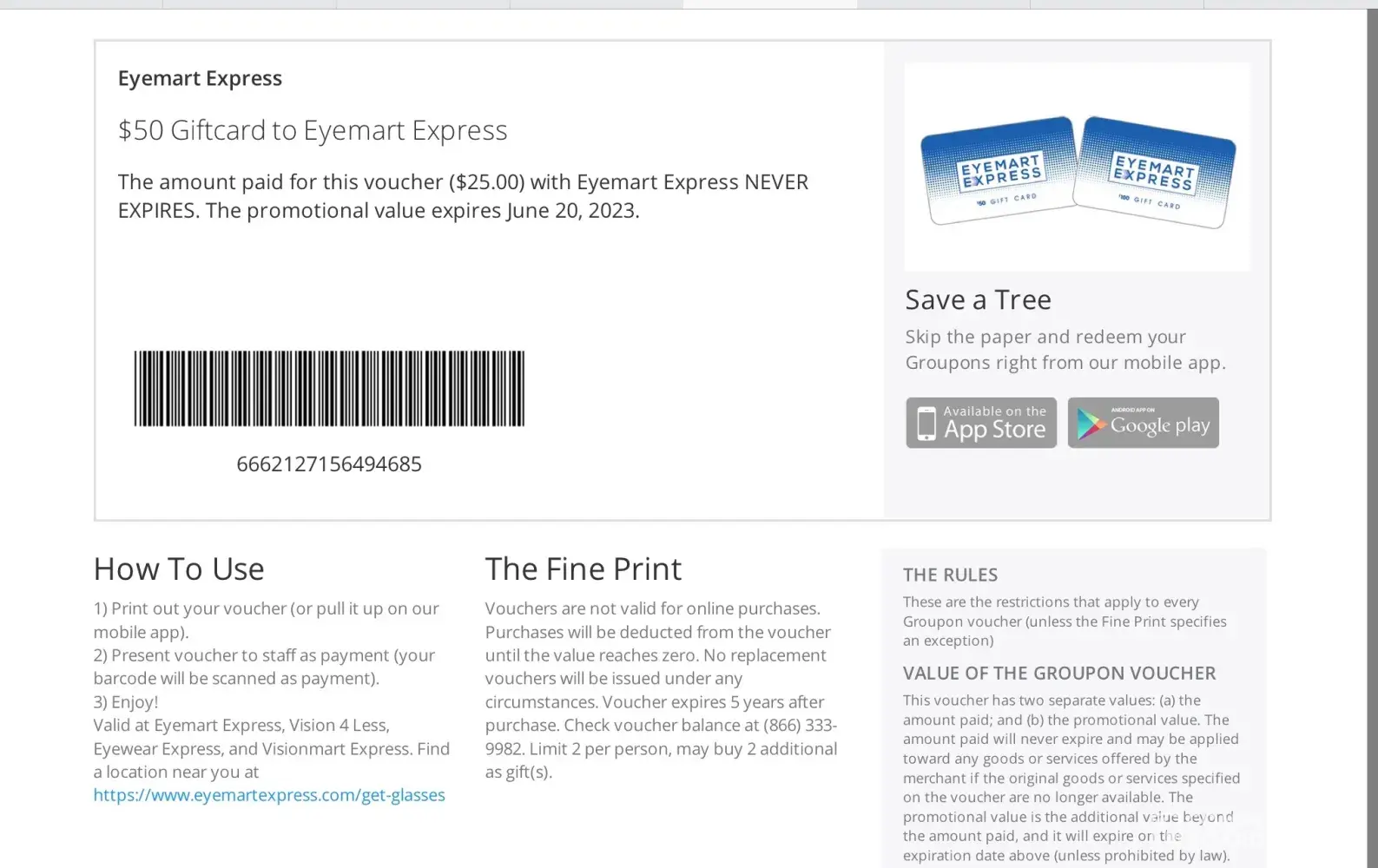 The person who called me had very little command of the English language but I did manage to get that he wouldn't help me either until I submitted a picture of "the card". Then, the Eyemart people decided to call their corporate office to see if they could help. Here is what THEY found out: Groupon apparently gave me a barcode of an a Eyemart Groupon that had already been purchased on June 7, 2018 and had already been redeemed! Eyemart apologized and made it right! Groupon continued to email me after that, asking for the picture of "the card".