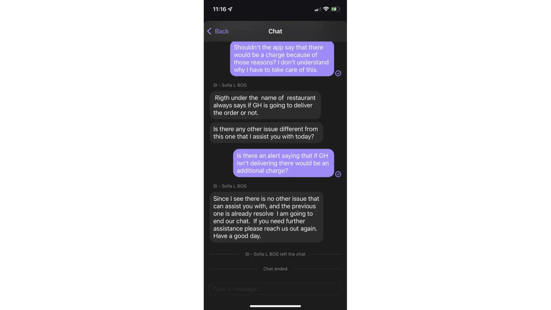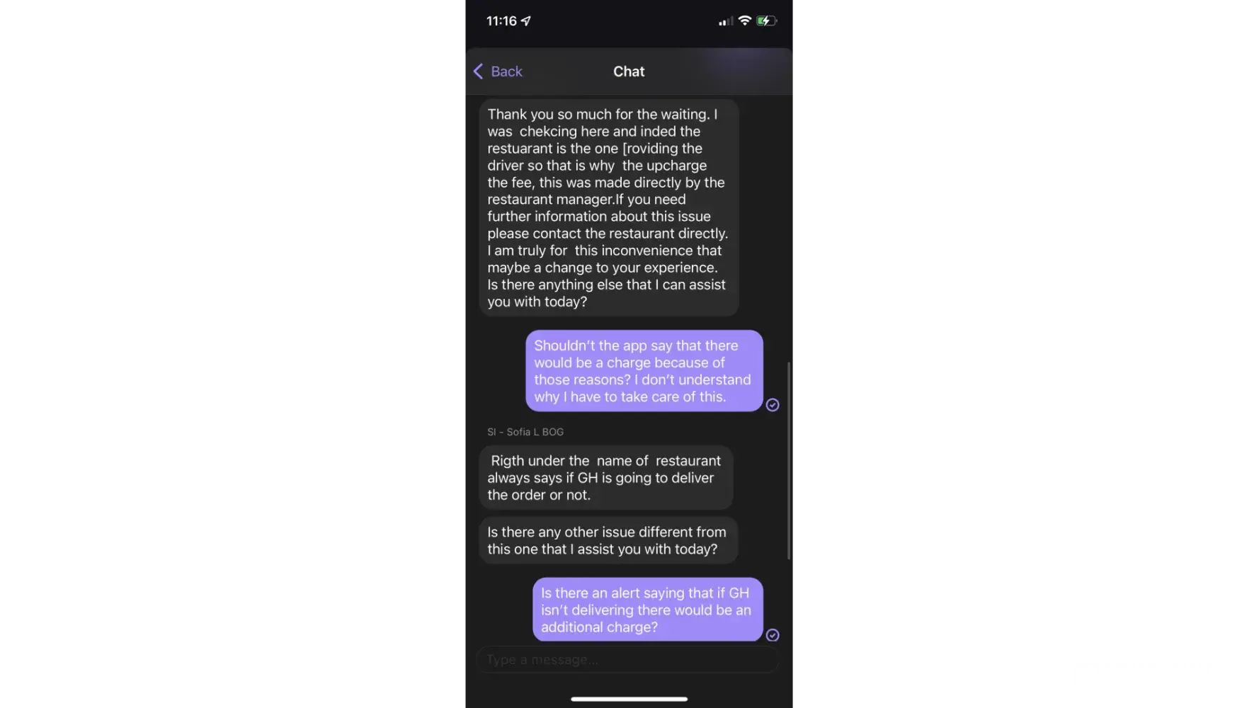 4. Grub insisted I only bought the naan that was on its way. Had no solution for $16.95 charge.