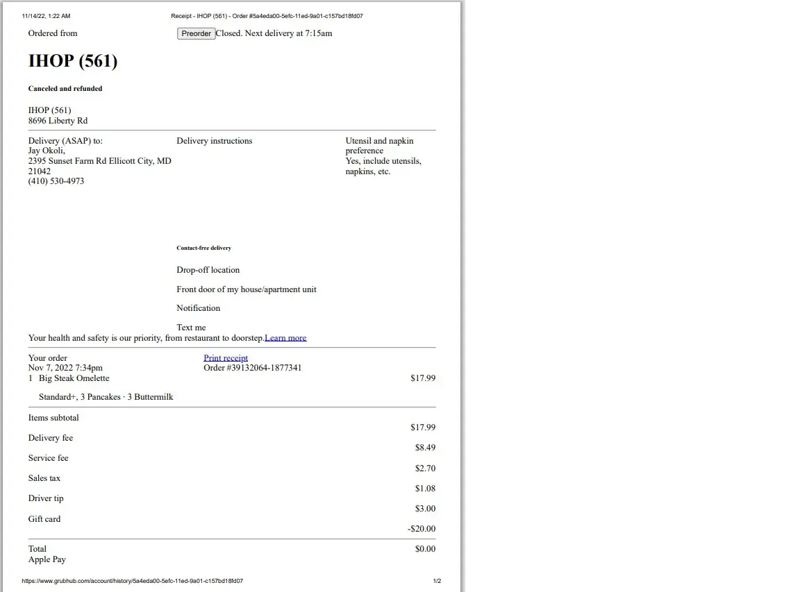 On the 7th of November, I tried to order food through my account with Grubhub and noticed my order were being cancelled after placing them.