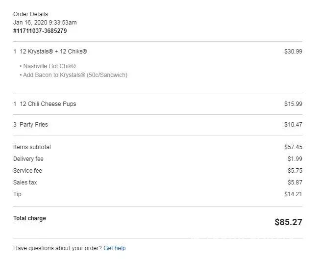 On 1/16/2020, I used GrubHub to order from Krystals (626 14th St NW, Atlanta, 30318) to deliver food to my work location (Experity, 384 Northyards Blvd, Suite 400, Atlanta, 30313) for a co-worker's anniversary celebration. I was not at the location (working from home) and had a 12:00 PM meeting which I had to attend offsite. I placed the order at 9:33 AM for a 11:30 AM delivery. The food alone totaled $63.32, and GrubHub's delivery/fees/tips brought the total order to $85.27. I received an initial confirmation that the order would be delivered between 11:30 and 11:40. Around 11:15, I proceeded to drive to my noon meeting, during which time I was notified by GrubHub that the order would be delayed and arrive between 11:50 and noon. I received a text message around 11:54 stating 'the GrubHub driver will arrive with your order soon'. I went ahead and began my meeting, thinking the driver was close to the delivery destination. Only at 11:58 did GrubHub try to call my phone, and at 12:03, sent a text. Because I was in my meeting, I did not see/hear either, and no delivery was made to my office. Only when I had a very brief break around 12:27 did I see the messages and attempt to reach GrubHub. My call to their customer service was placed on hold in a queue with an unknown number of callers ahead of me, and I could not afford to stay on the line for an undetermined amount of time to resolve the issue. After the meeting was over (around 1:15), I contacted my office to see if delivery was ever made. It had not been delivered. I e-mailed GrubHub and asked for a refund. They responded that since the food had been prepared and they had attempted to contact me, they could not issue a refund. I unsuccessfully attempted to contact Krystals on 1/[protected]) and went by on 1/27. Krystals said it was no longer their concern once GrubHub picked up the order. I feel the initial delay contributed to the lack of communication and failure to deliver.
