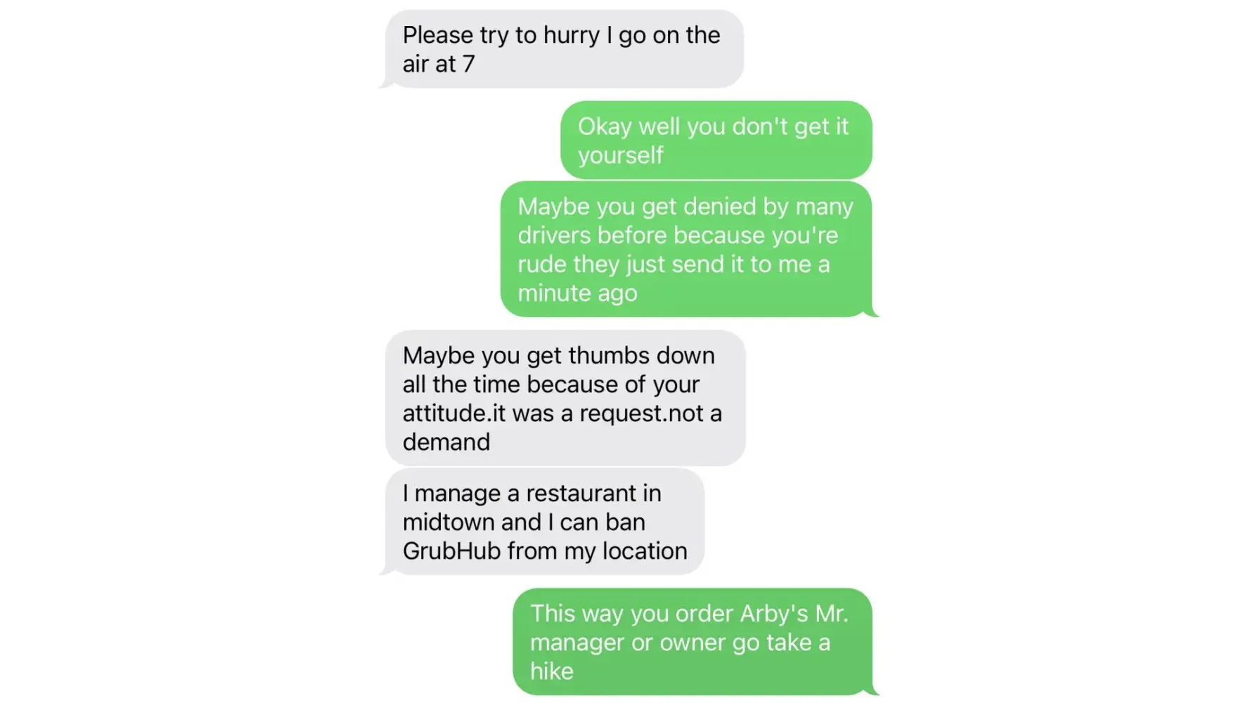 I am a driver will Grub Hub I received an order I want to pick it up on the way to arbys Customer text me to hurry up so I told him if I have to hurry up why they don’t get it themselves So to avoid all trouble I called Grub Hub support to cancel the order but they have unprofessional kids working the system and it gets even worse and creating the conflict between the customer and driver and the damn GrubHub doesn’t even have a direct line to solve the problem so YOu be basically Lost your mind and I lost my job already with them but think I’m going to go further suing them because they just close my accounts pause it For investigation and they know clearly that’s dead stupid customer caused the entire problem but for the workers who work for Grub Hub so they don’t know any better just to make things worse