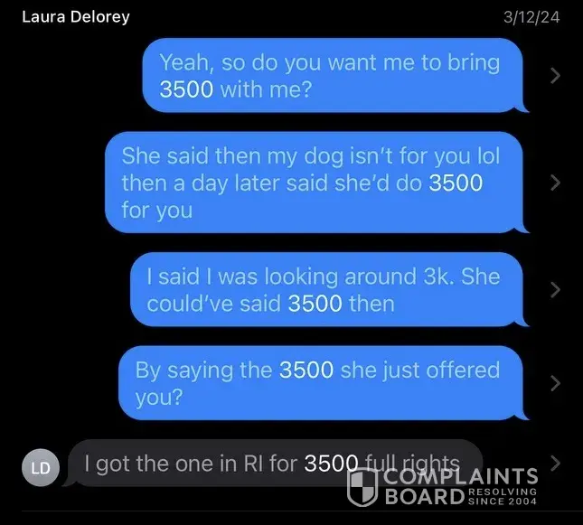 I have also been scammed by them 3500 she sold me someone else puppy although her website says she doesn’t work with other breeders the papers say the dog was bred by someone else.