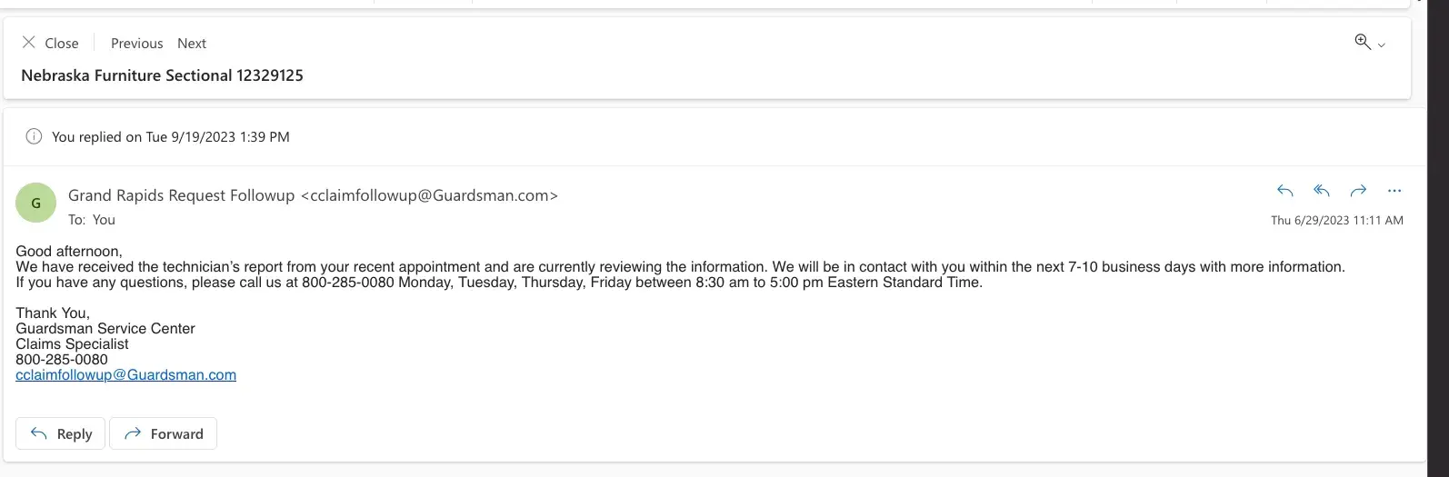 However, after the initial assessment, I waited patiently for almost a month, anticipating contact from Guardsman, but received no correspondence whatsoever. It wasn't until May 8th, nearly five weeks later, that I finally received an email from your follow-up team. The email stated that I would be contacted within 7-10 days after receiving that message but never did - one ever contacted me about my claim and or technical appointment and a final verdict and if or when my sectional would be fixed.
