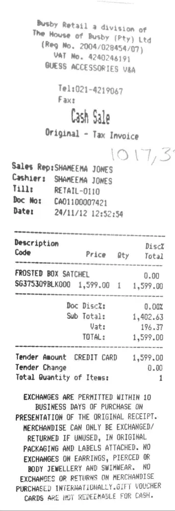I sent her the receipt and she went to the Guess shop in her area and since the 6 month warranty expired a week or 2 before they said they couldn't help her. I feel like both our consumer rights have been violated, we bought something that was suppose to be good quality for R1599 but in the end we bought low quality branded waste for more than it is worth, we feel completely cheated and will never buy from Guess again and I suggest other people shouldn't bother either!