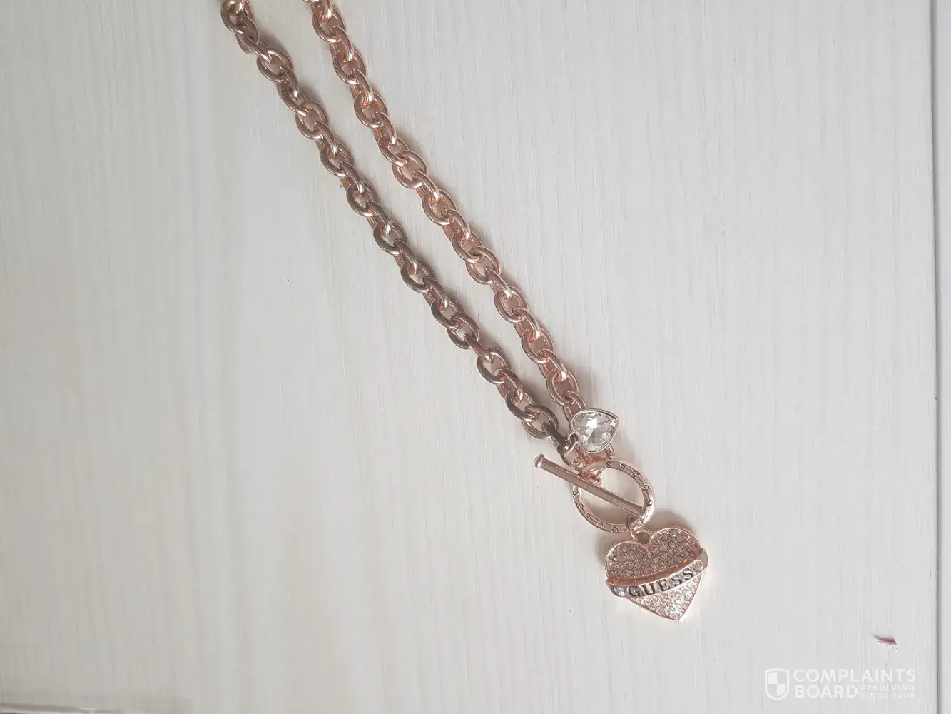 I bought 2 necklaces and 2 pair of earrings at of the jfk shop in new york airport in may 2019.I have worn both necklaces twice. There is a stone missing out of one of them. The other one is tarnished. I have bought jewellery from guess before and nothing like this has ever happened before. The necklaces were not cheap. I have worn the earrings quite a few times the earrings are fine