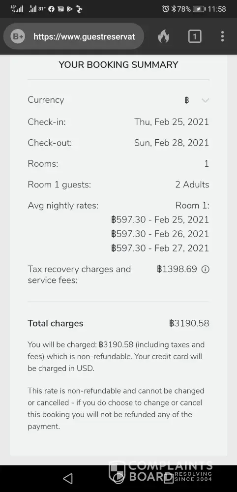 Hotels.com taxes/service charges for same booking arejust 324bt for same stay CW 1398bt I was charged by guestreservations.com. This means total for the same room is $71.94 with Hotels.com