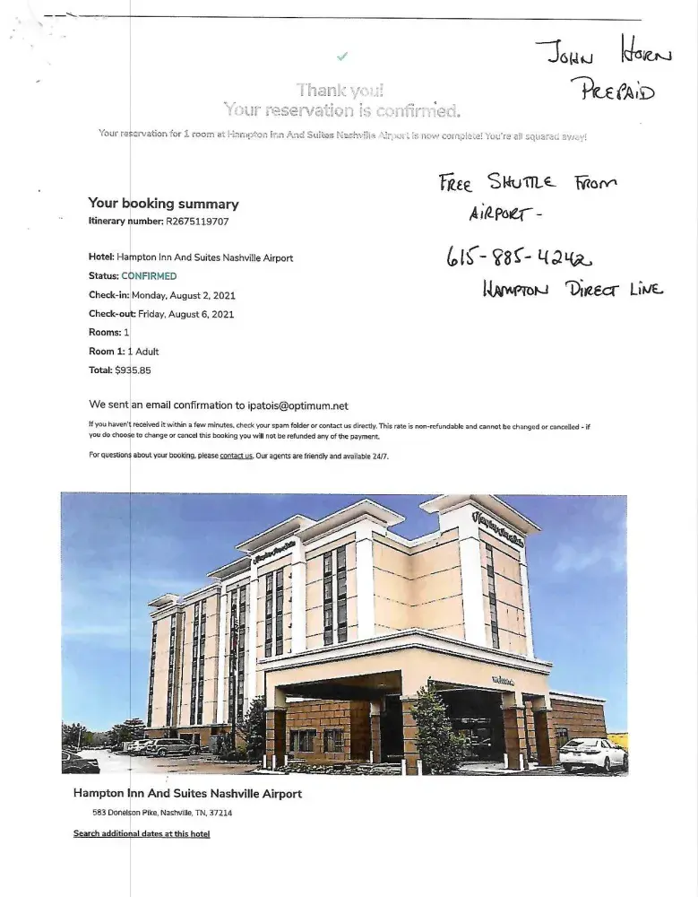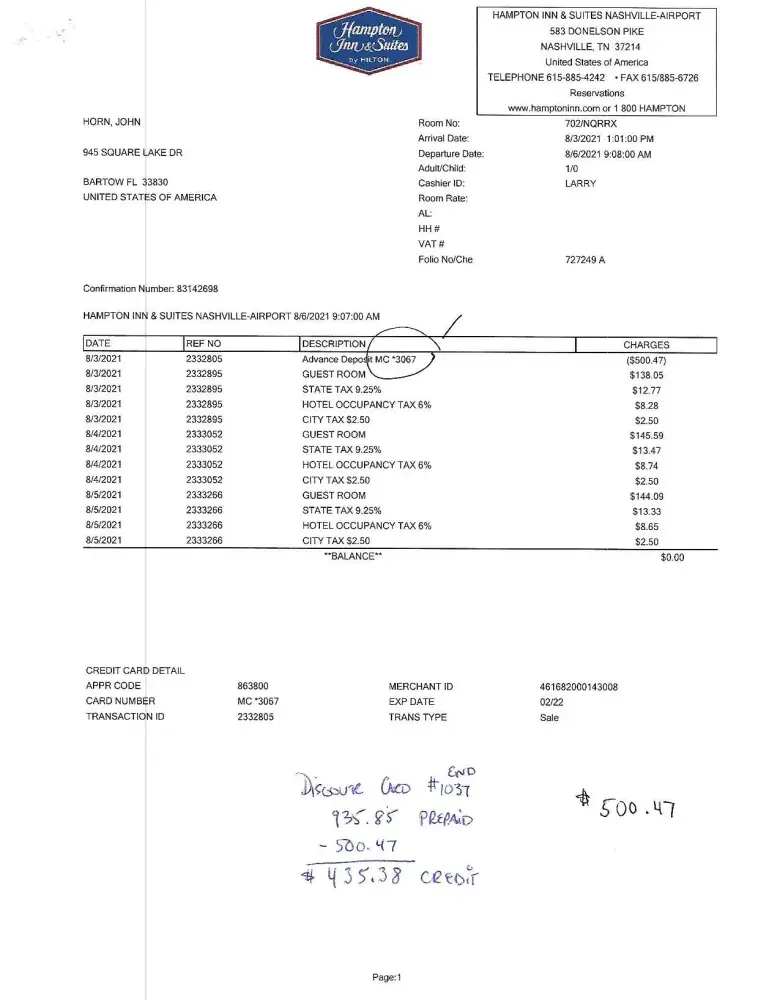 Prepaid for hotel booking Aug 2-Aug 6th for my employee traveling from Florida to Nashville and charged the room on my Discover card. Conf #R2675119707. Our employee arrived 1 day later Aug 3 - due to airline strikes. Hampton Inn was notified of the change in dates. After stay the hotel bill came to $500.00 incl tax and service fees. It has taken me several phone calls, and 1 1/2 hrs online to finally reach a customer service representive who then had to transfer me to another customer service rep, only to be told that there are cancellation fees...I am expecting a credit back on my Discover card in the amount of $435.