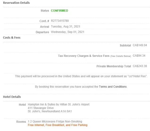 I had been standing by on flights for 3 days, 12 hours a day in the airport, when I went to rebook the hotel room at Hampton Inn near the airport in St. John's, having been unable to get on once again. I was completely exhausted and stressed out, and thought I was booking on the hotel's website. I went through and saw the fare would be the same as the other nights I had stayed at that hotel. When I saw the charge on my bank account I was floored. $94 in taxes and fees on a $149 hotel room is beyond ridiculous. Had I known this would happen, I most definitely would not have used guestreservations.com, and only did so by error. Not only that, but I couldn't cancel the reservation because it's non-refundable with the site, unlike every reputable reservation site out there, including the hotel's. I'm thoroughly disgusted by this, feeling like I have been taken advantage of 100%.