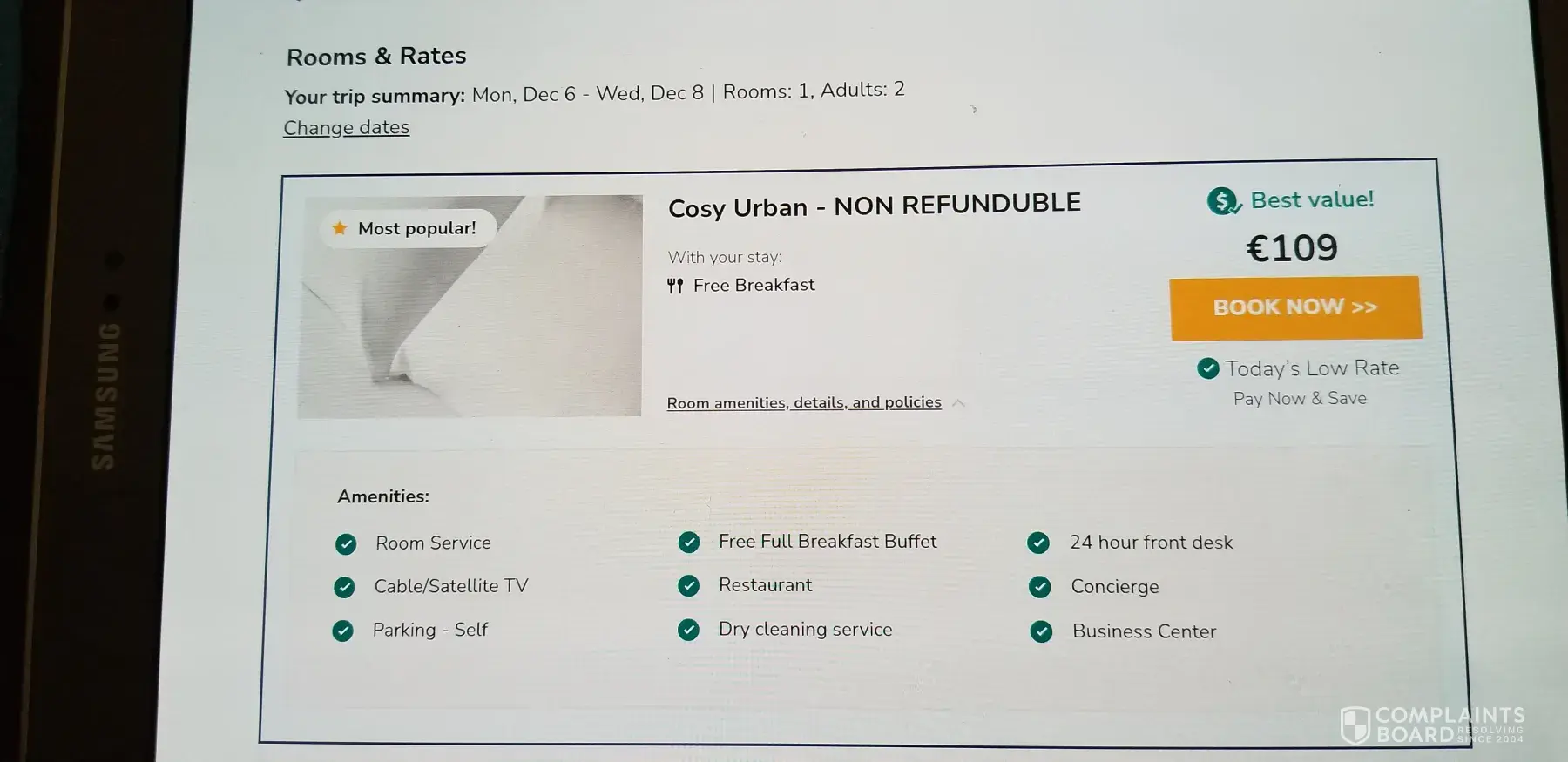 In addition the advertised rate included breakfast but when I received my confirmation there was no mention of a free breakfast so I contacted customer support (5 or 6 times now) and despite proving the deal should include breakfast they simply ignore the fact and provide some meaningless response just to close the complaint.