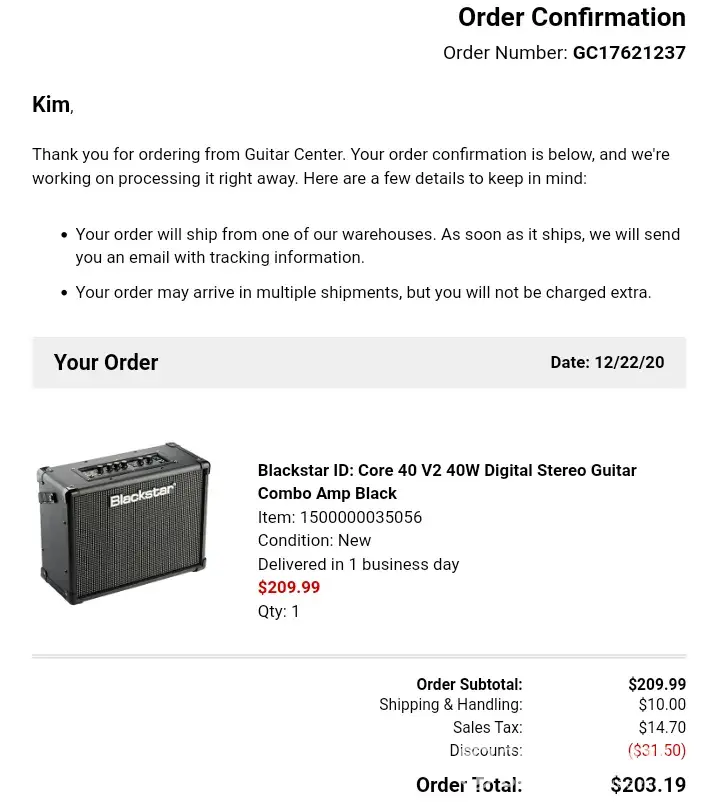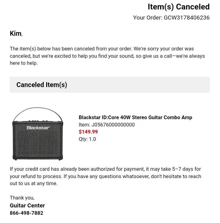 I have been debating about writing this or just letting it go but I can't.. What guitar center just did to me is probably one of the strangest shady things a company has ever done to me and I think I need to see what others might think so they can see how guitar center does business. So here goes trust me I cant make this up.. Today is dec. 22 2020 and yesterday I ordered a blackstar v2 40 watt stereo amp on clearance for $149 good deal I thought right? So I thought.. So anyway after ordering my new amp last night and paying $10 extra dollars 2 day shipping to get it by christmas. Here I am next day getting an email saying my order was cancelled, but I didn't cancel it and I need it by christmas so I call to see what is going on. And I find out my order was cancelled because guitar center cant give it to me at that clearance price or "they won't make money" I was told. So store clerk told me I have to pay $209 for the amp and he can give me 15% off. What ever happened to honoring your set clearance price and if it was a mistake they give it to that person for set price and change ad like they did in old days and how any business with integrity does these days? But I guess them days are gone.. So basically what I am saying is I bought an online clearance item and next day cutting it close to xmas was told I cant have that deal and I now have to pay $30 more for the exact same product because they won't make enough money off me. It's not like the product wasn't available and I had to choose something new no! They made me put up another $203 dollars when I still had first $173 pending that I wont get back on my bank account for up to a week. Thank god I happened to have an extra $203 to put up if I wanted the gift to get here for christmas.. And instead of giving me free overnight shipping he still made me pay $10 for the 2 day.. All I have to say is don't put an ad up and when someone buys your product tell them they have to now pay full price and put up extra money and pay shipping.. That is the very definition of false advertising! Now I see why guitar center is going out of business. It's only an extra $30-$40 I had to spend but that's a decent percentage when your dealing with a $200 product.. They probably won't make it up to me. All I know is now i'm hoping I get it by christmas and wishing I would have just got it through amazon like I do everything else it would have been cheaper the shipping would have been free and I wouldn't have an extra $173 tied up in my bank account. Good thing I don't need that money for xmas dinner of something.. Sheesh! Guitar center is a scam and a joke..