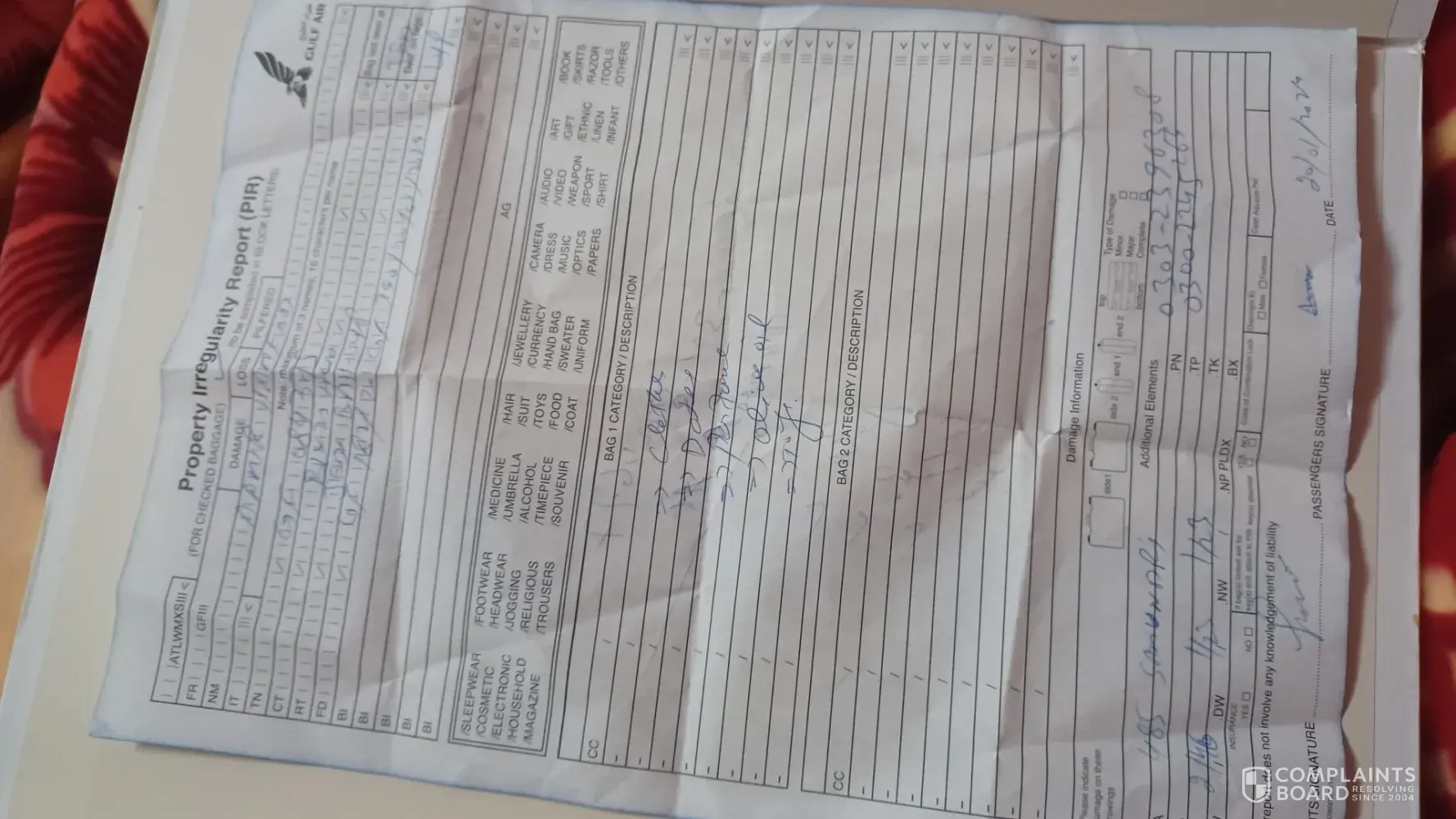 I am writing to formally report damage to my checked baggage on my recent Gulf Air flight: