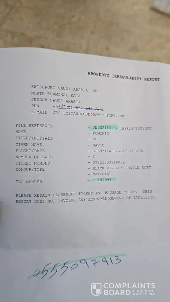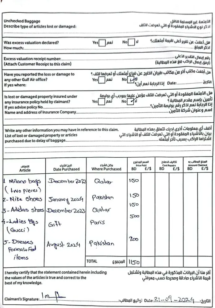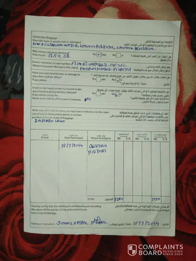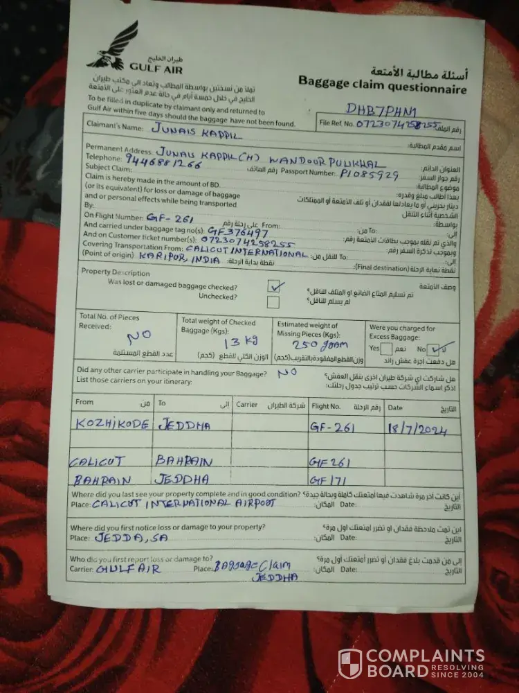 Greetings. My family traveled by Gulf air on 11.04.2024 from MAA to JED. During transit, carrier left one of our baggage in BHU. This information we got after reach Jeddah. So we raise a complaint for baggage lost. We submit our boarding proof passport copy everything. During registering the complaint the airport people told us, we will check the baggage in Bahrain, if we found we will send it to Umluj (because our home location is Umluj 550km from JED). After few days the airport people called and told us they found our luggage in Bahrain and they can send up to Jeddah only, they cannot able to send to Umluj. I requested them, from my home location Jeddah Airport is too far, so please send it at least Yanbu airport but they did not do anything. This makes me too much stress. I am registering this complaint for baggage lost and delayed delivery. I need Compensation from the career. I enclosed some proofs for your reference. my mail id: [protected]@yahoo.com