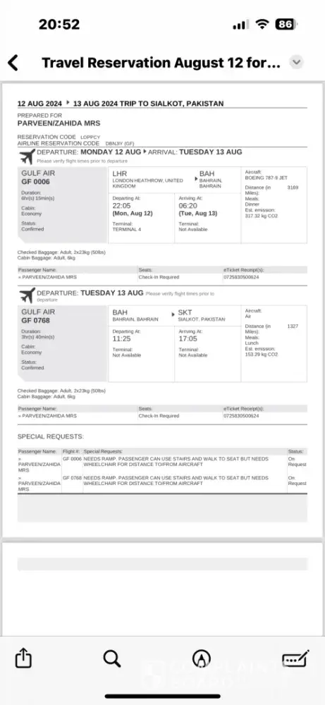 I booked these flights for myself, Kane Turner and my cousin James Radcliffe for the sole purpose of travelling to Thailand to celebrate an elderly relative's surprise 90th birthday party. Upon booking, the flight it was supposed to arrive in Bangkok on the morning of 30.12.2024 with a 2 hour lay over in Bahrain, it was due to depart Manchester at 10.30am on 29.12.24.